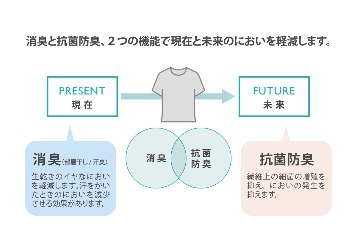 生乾きのイヤなにおいを軽減します。汗をかいたときのにおいを減少させる効果があります。