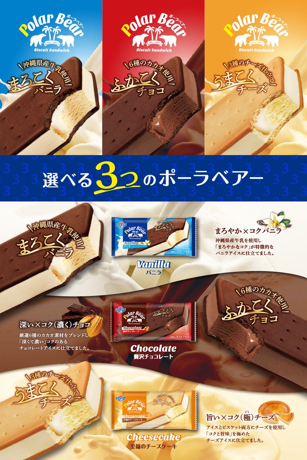 ブルーシールの代名詞のひとつ、ポーラベアーは、バニラアイスをココアビスケットでサンドした手軽さで、多くの皆様に楽しんでいただいているロングセラー商品です。