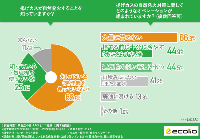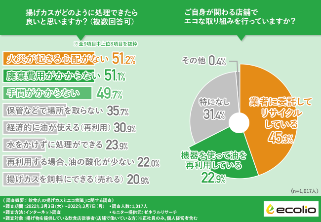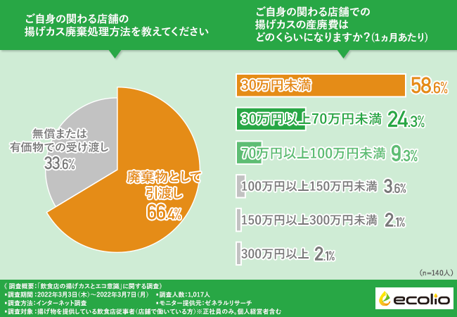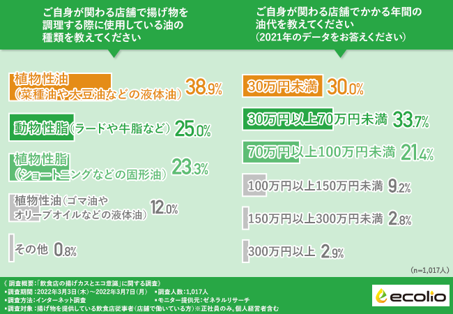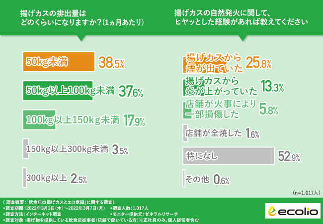 株式会社エコリオ(本社所在地:東京都中央区、代表取締役:浦野 由紀夫)は、揚げ物を提供している飲食店従事者(店舗で働いている方)を対象に、「飲食店の揚げカスとエコ意識」に関する調査を実施しました。