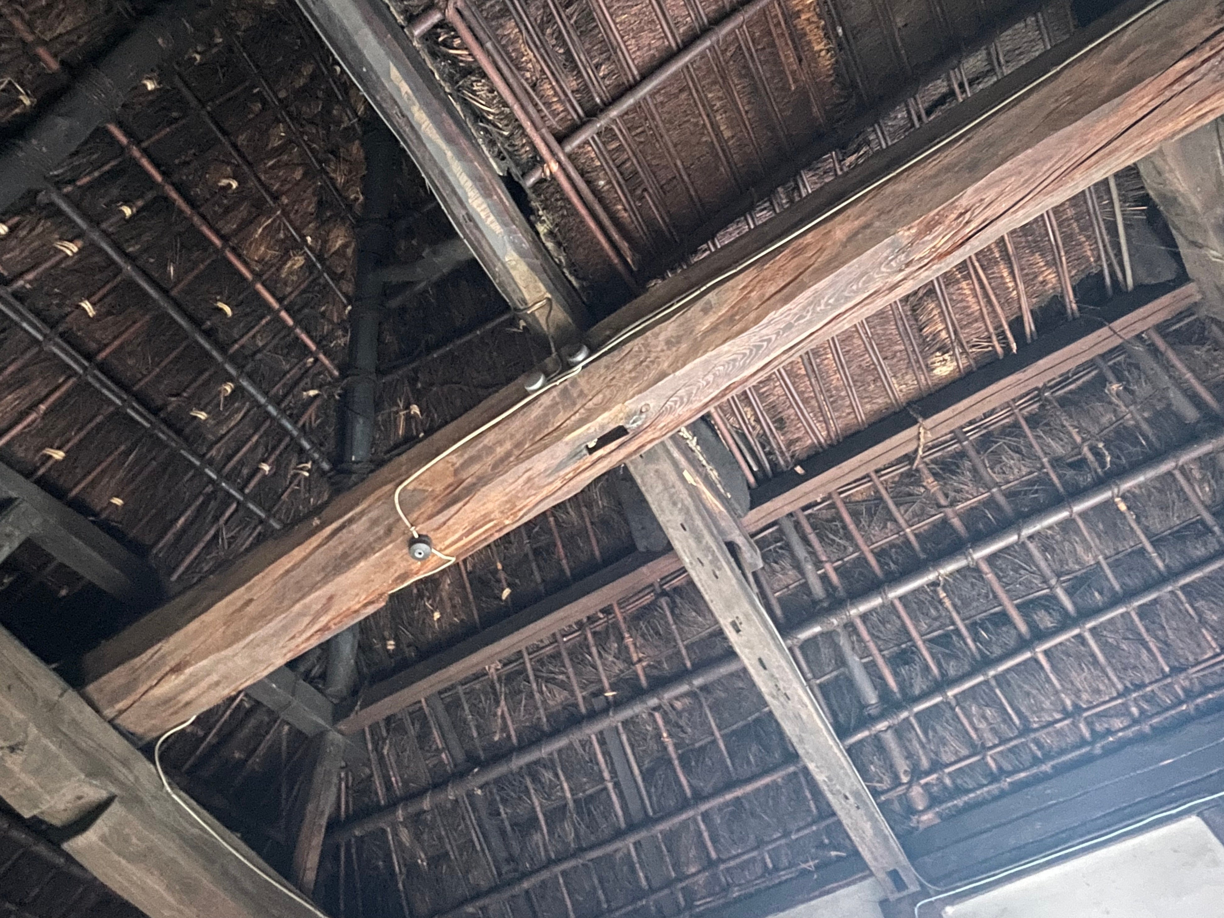 ←岩瀬酒造母屋の梁。 帆柱の一部が使われていると伝わっている。