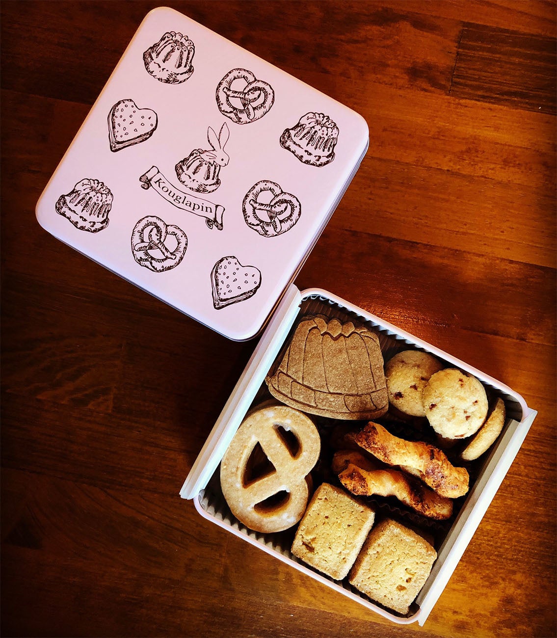 湘南ゴールドのプレッツェル・クグロフ型スペキュロス・サブレキャラメル・サブレロマラン(ローズマリー)・フィユテフロマージュ(チーズパイ)の5種類のクッキーを、ウサギモチーフのオリジナル缶に詰め合わせました。