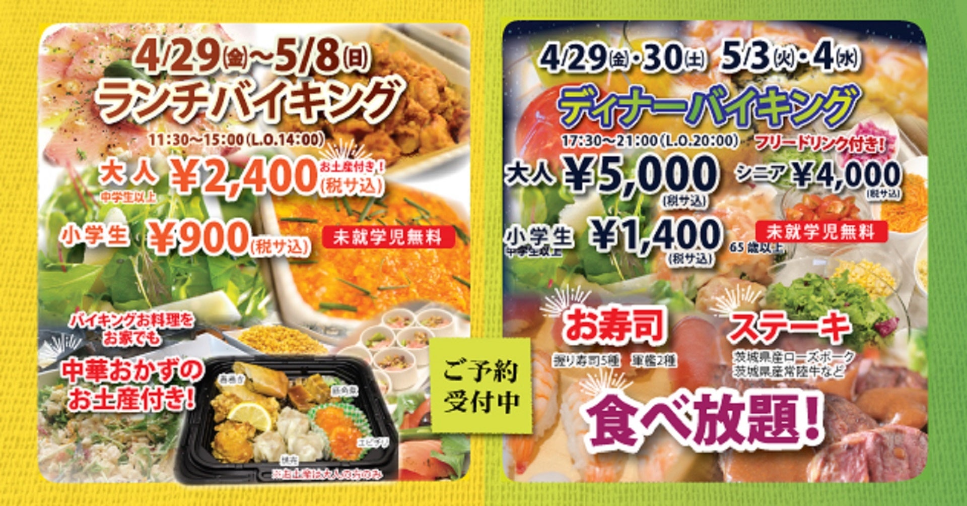 - GW4日間だけのディナーバイキング付き宿泊プラン(2食付)