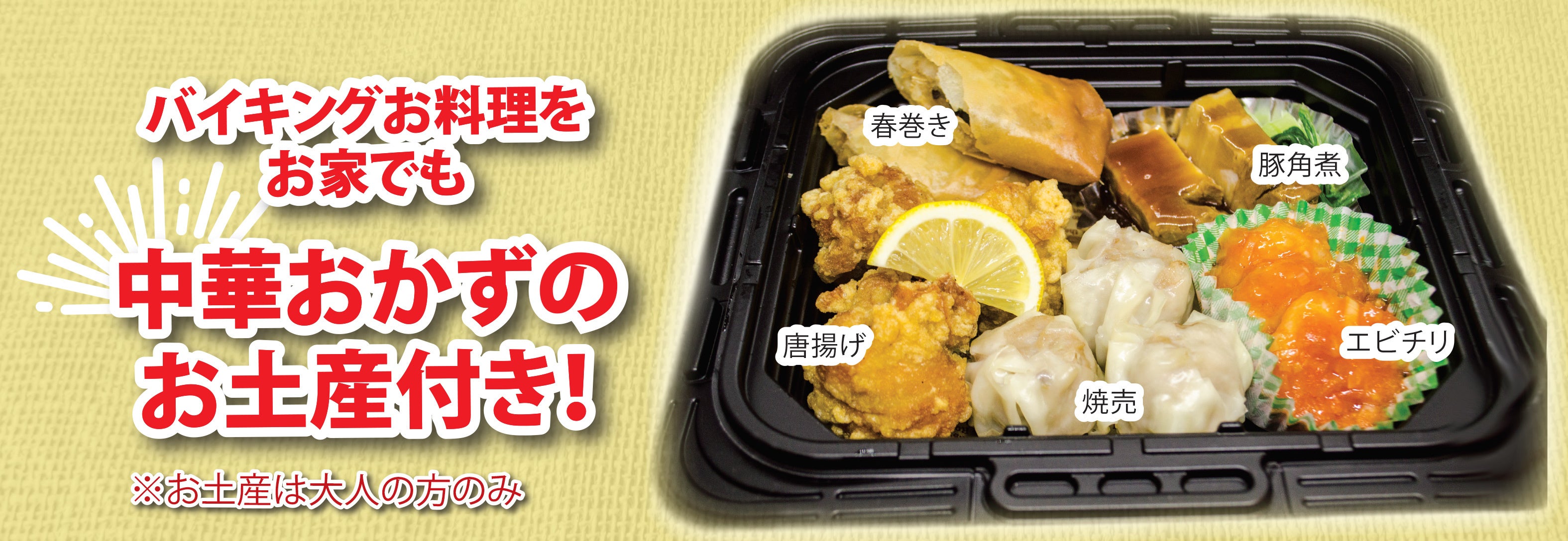 特製中華のおかずをお土産としてプレゼント。春巻き・唐揚げ、焼売・豚角煮・エビチリと定番中華が揃っています。バイキングに食べに来られなかった方へのお土産にいかがでしょうか。