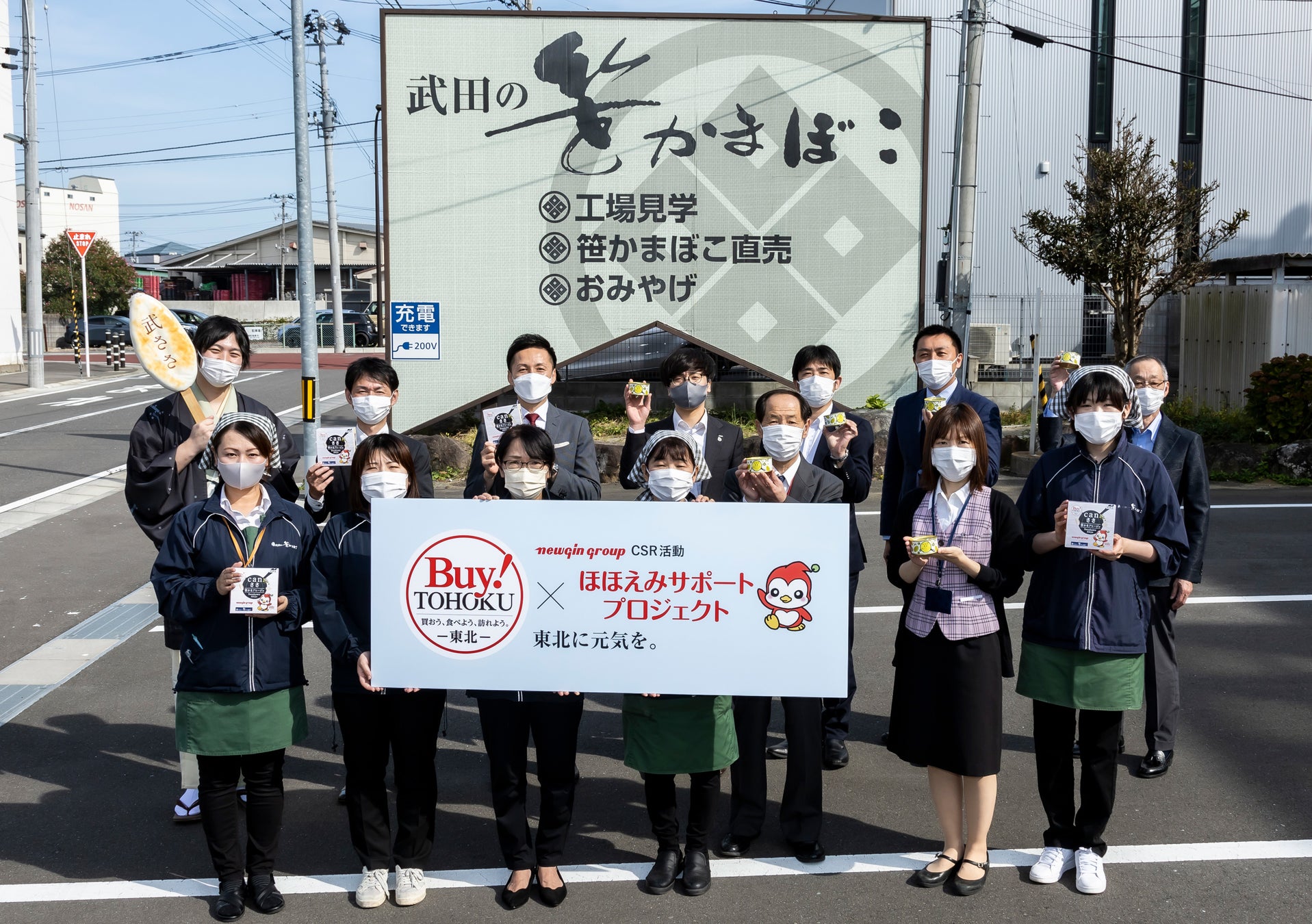 ニューギングループはこの趣旨に賛同し、2011年以来、東北の様々な企業の復興を支援すべく、Buy!TOHOKUプロジェクトを通じて協賛企画としてコラボグッズの製作~配布活動を展開してまいりました。そして今回、その協賛企画第16弾として宮城県塩竈市の株式会社 武田の笹かまぼこ 様(代表取締役社長 武田武士氏)とのコラボが実現いたしました。