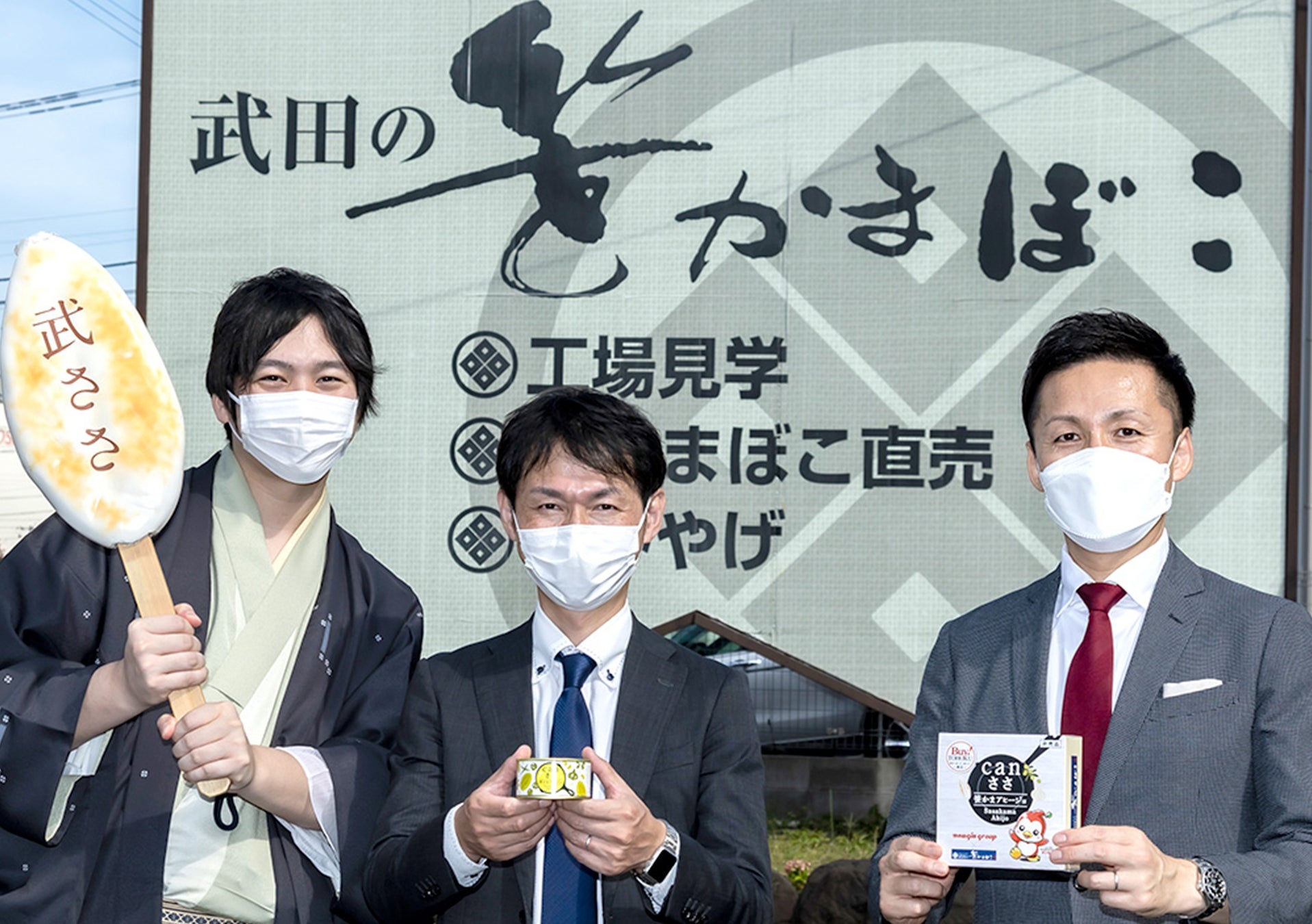 今回のコラボ商品は、「Canささ 笹かまアヒージョ」。これは、武田社長が東日本大震災で被災された経験から、笹かまぼこの美味しさをできるだけ長持ちさせるため“缶詰”にすることを発想され、さらにそれをより多くの方に手軽に楽しんで頂きたいと“白ワインに合うおつまみとしてアヒージョ”にするという2つのユニークな発想から生まれた商品です。