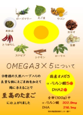 一般的なたまごと比較して「OMEGA3×5」には、オメガ3脂肪酸が約5倍含まれていることを表しています。