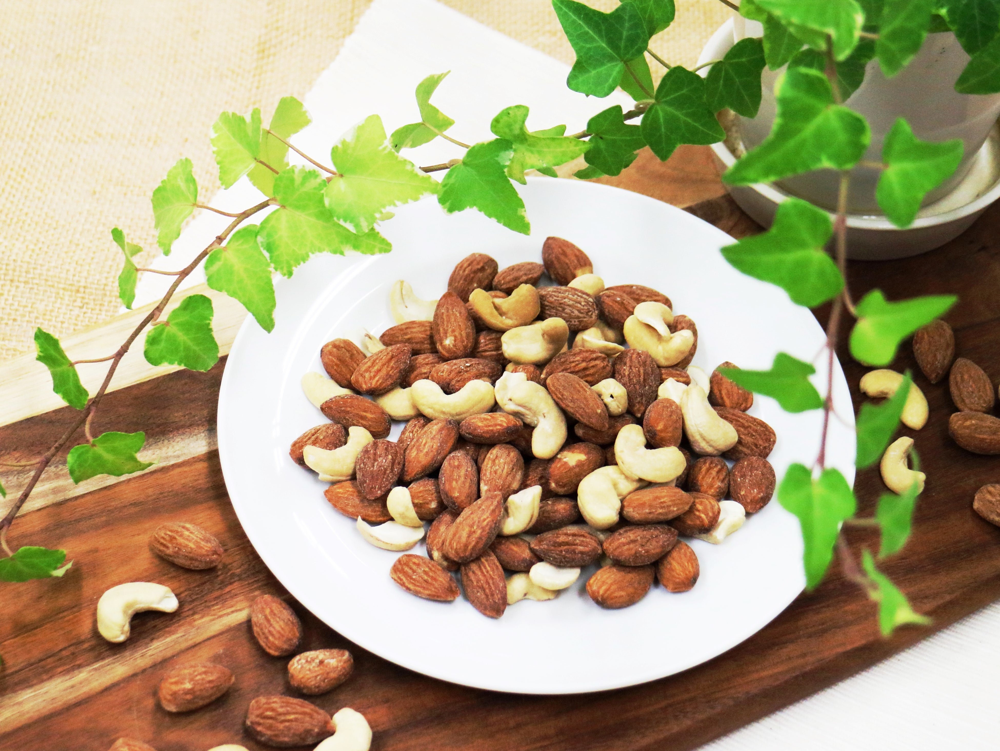 商品特徴:素焼きしたアーモンドとカシューナッツのミックス。エキストラバージンオリーブオイルとぬちまーす(沖縄の塩)で味付けしました。
