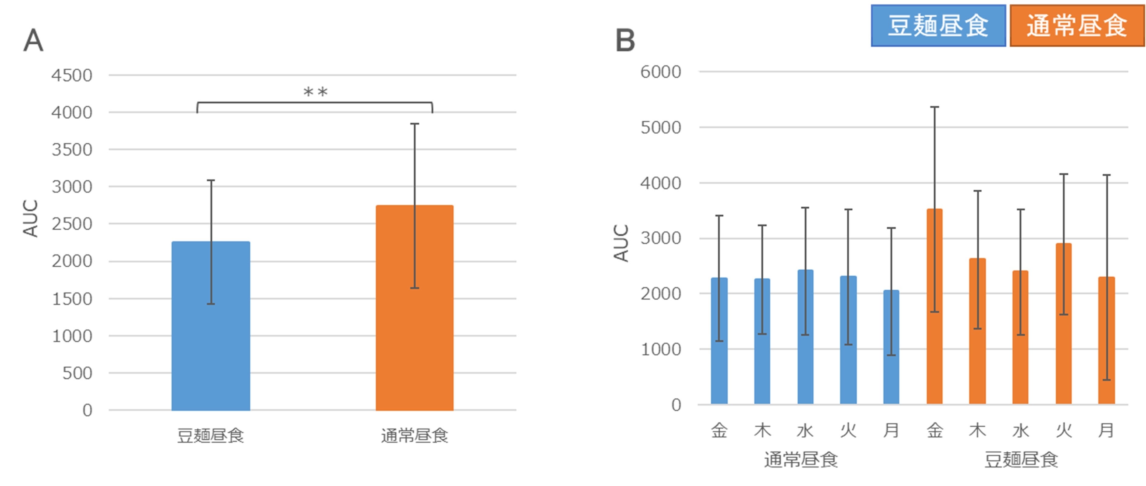 昼食に「豆類でつくった麺」を摂取すると、白米・うどん・パンの摂取と比較して、血糖値AUC(曲線下面積)が有意に低くなる。