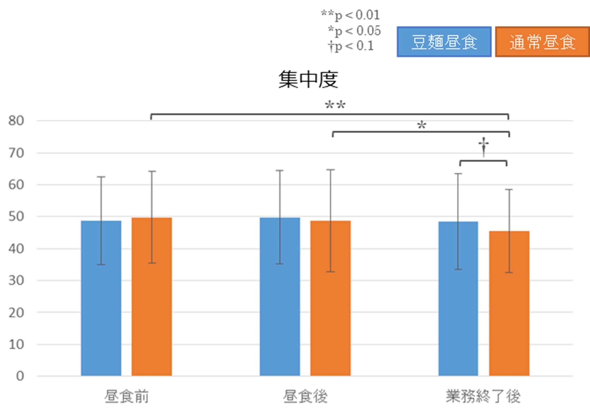 脳波を計測した感性値の結果から、昼食に白米・うどん・パンを摂取すると、昼食前後と比較して定時終了前には「集中度」が有意に低下したが、「豆類でつくった麺」を摂取すると、「集中度」が維持され、低下が防止される。