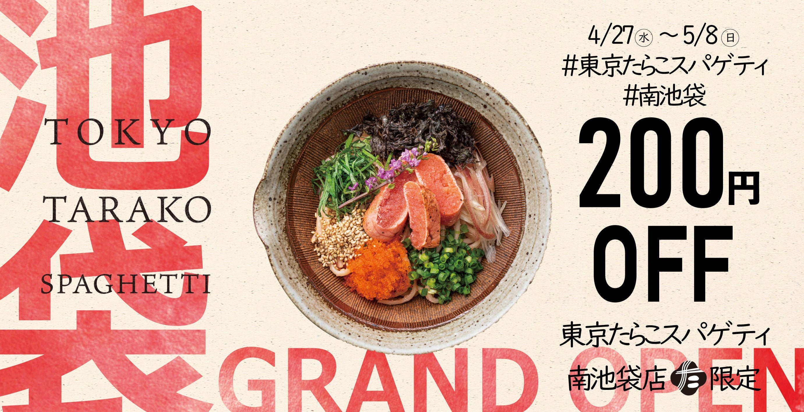 2022年4月27日(水)~2022年5月8日(日)の12日間、南池袋店限定で指定のハッシュタグ #東京たらこスパゲティ と #南池袋 の2つをご自身のTwitterまたはInstagramアカウントにて投稿していただきます。お会計時に投稿内容を確認させていただき、キャンペーン参加条件を満たした方はその場で合計金額の税込み価格より200円引きいたします。