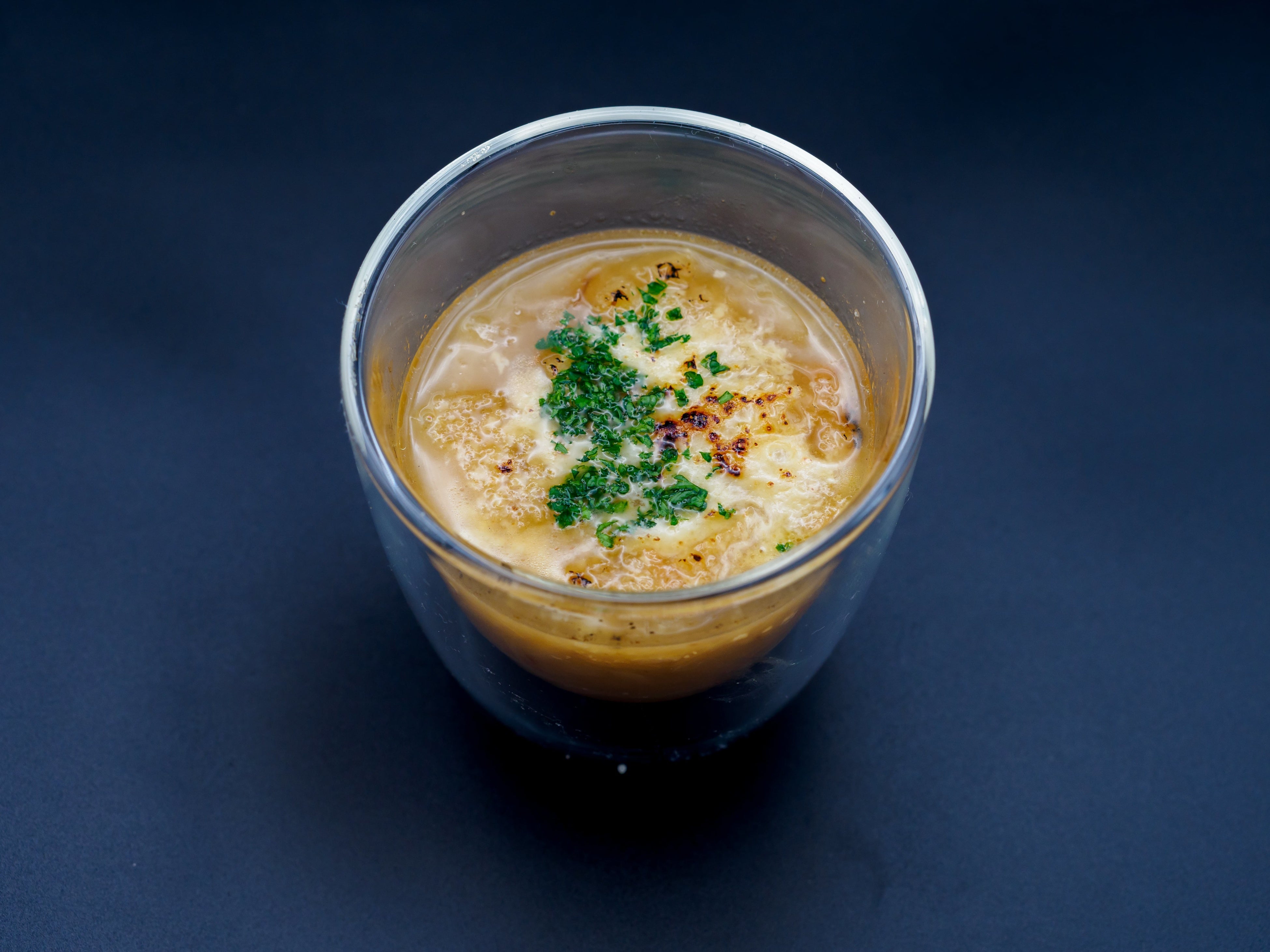 仕上げにチーズとクルトンを散らしてバーナーで炙り、甘くてコクのあるスープになりました。