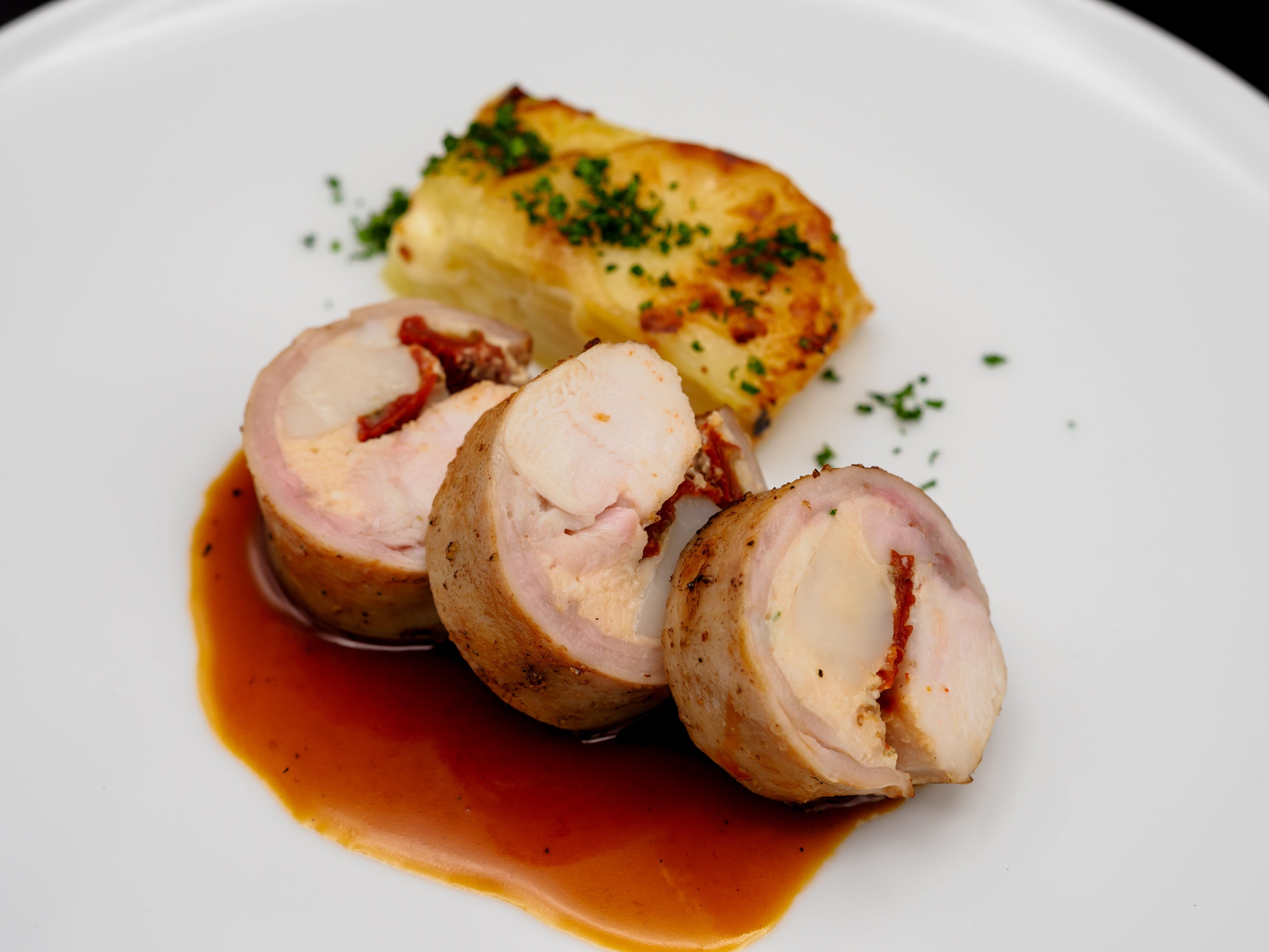 帆立貝とドライトマトをクセがなく淡白な味わいの仔うさぎの背肉で包み込み、低温でじっくりと火入れすることで、柔らかくしっとりとした口当たりに仕上げました。