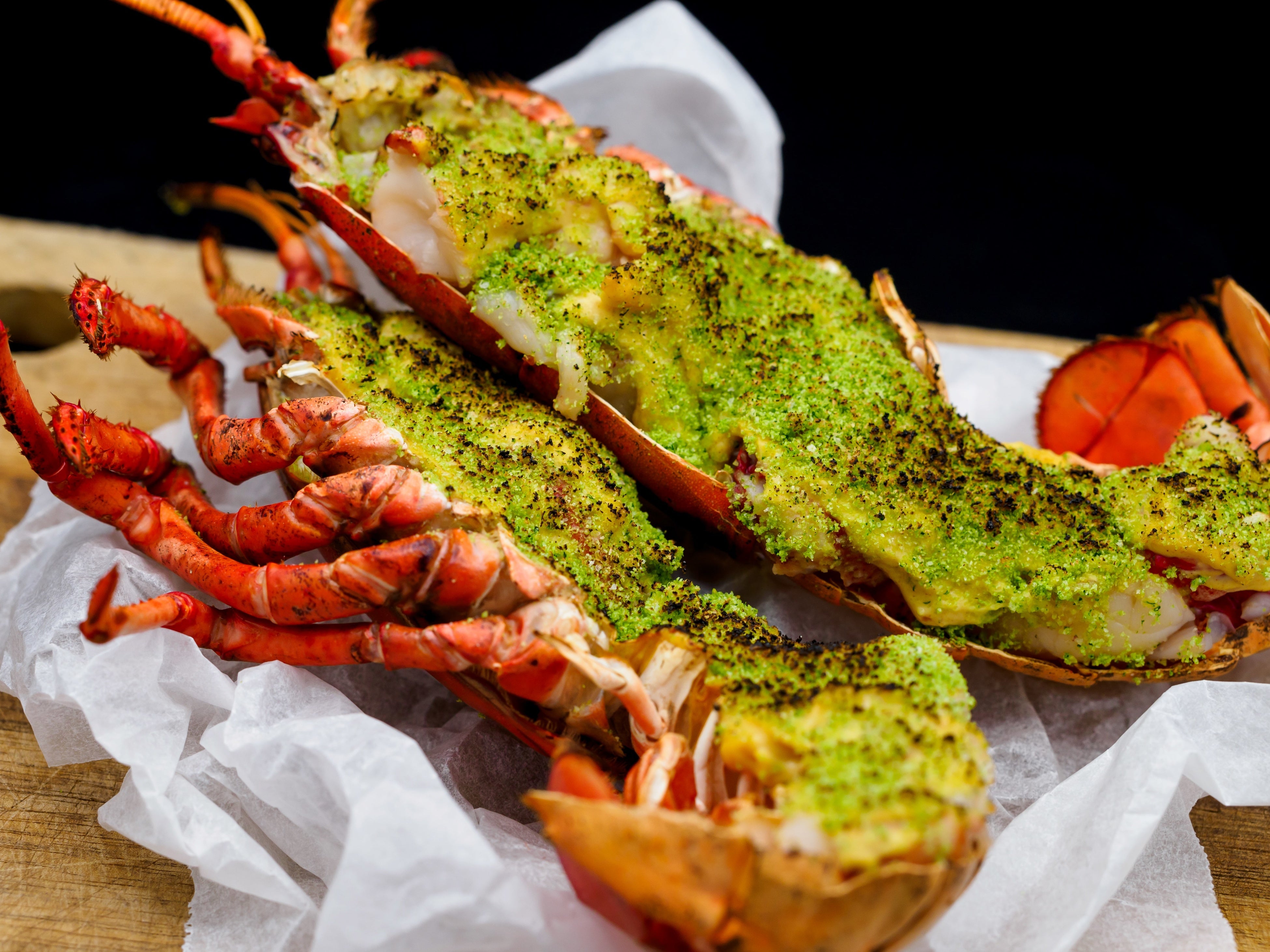 パセリやニンニクで風味をつけ、アクセントにマスタードを加えて炒めたパン粉をロブスターにまぶし、オーブンでしっかりと焼き上げました。