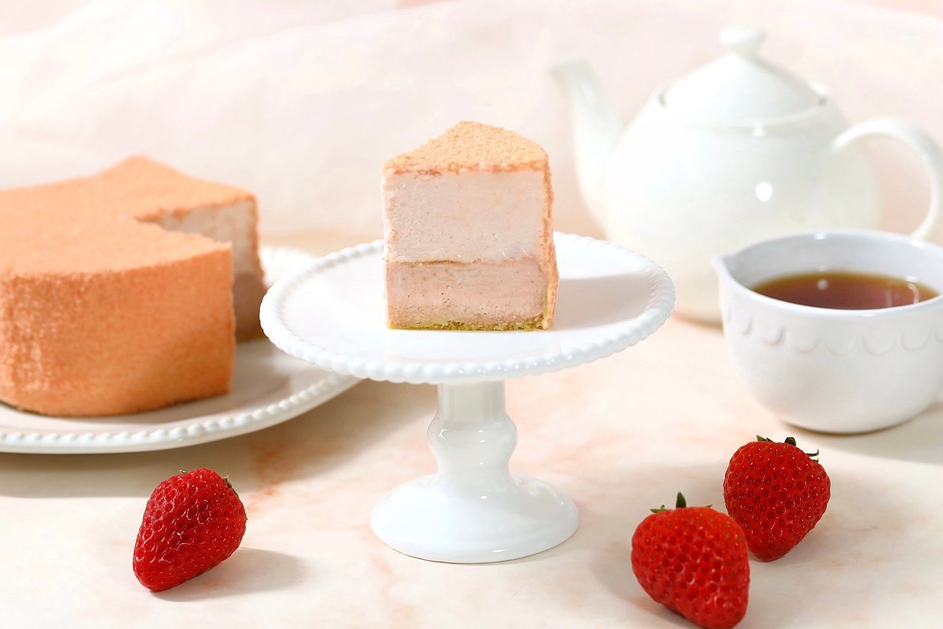 カットすると、中はレアチーズケーキとベイクドチーズケーキの2層仕立て。上層は、レアチーズを合わせてクリーミーな口当たりに。しっかりと焼き上げた下層のベイクドチーズケーキが香ばしさをプラスします。口に運ぶと苺の甘い香りがふわりと広がり、コクのあるチーズの風味とのマリアージュをお楽しみいただけます。暖かくなってきたこの季節にぴったりな、春らしいやさしい味わいのスイーツです。