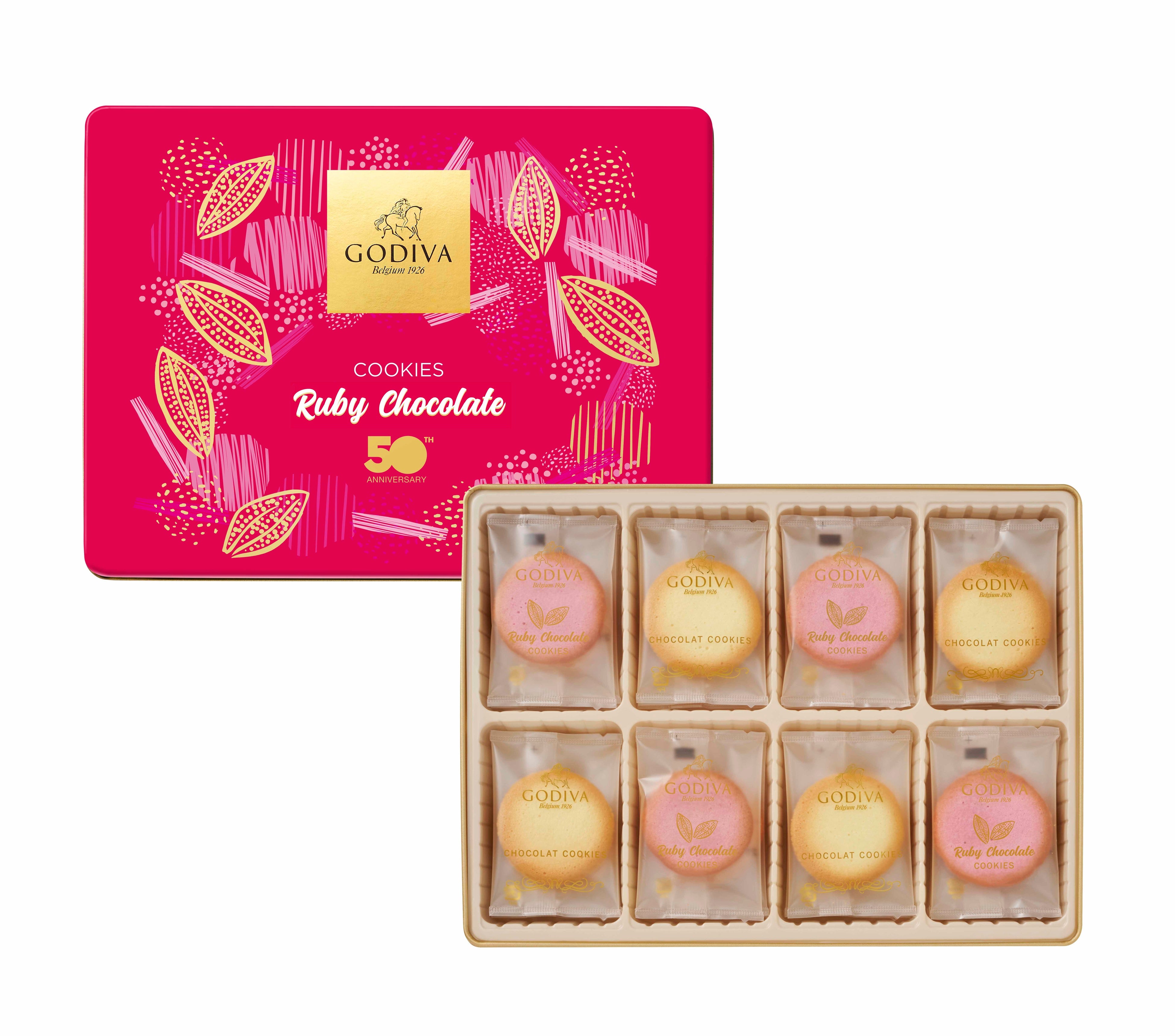 甘酸っぱい「ルビーチョコレート」を使用した限定フレーバーのクッキーと懐かしい味わいの「ショコラクッキー」をゴディバ日本上陸50周年を祝した限定パッケージで。