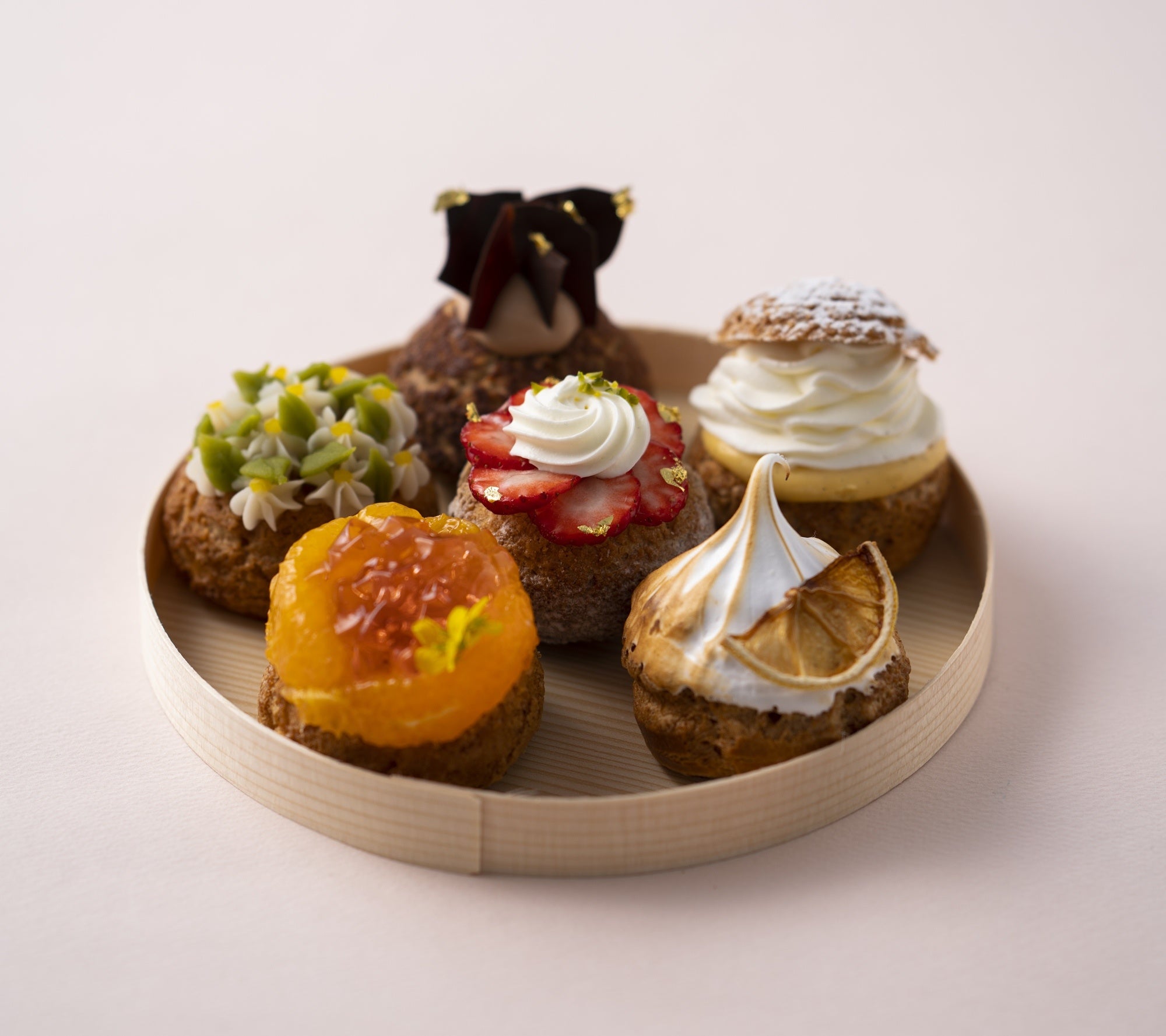 ティシエが作る彩り豊かな手まりシュークリームを、和を感じる“わっぱ”に詰めるスタイルは手みやげポイント高し!会場では実演も。