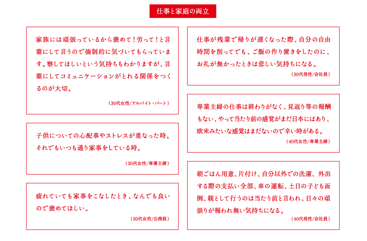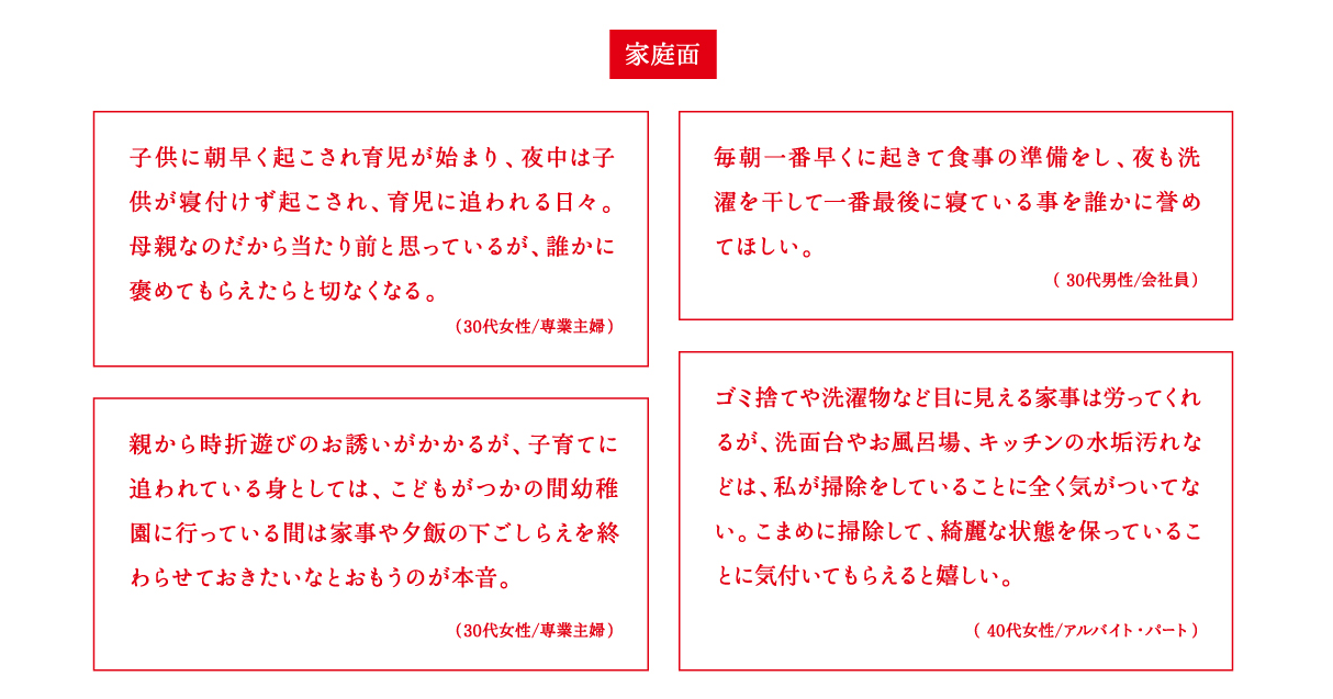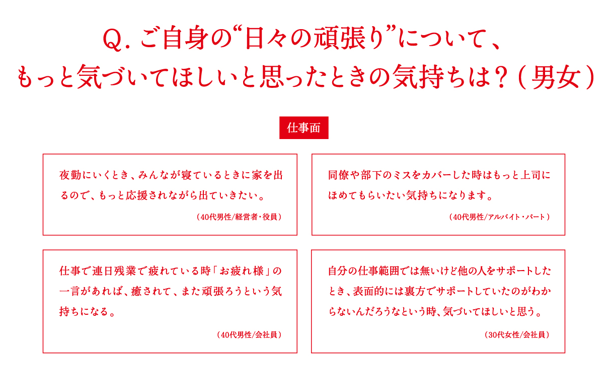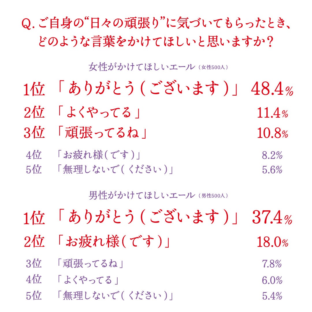 本プロジェクトを始めるにあたり、2022年3月に20代から60代の男女1,000人へ「”日々の頑張り”に関する実態調査」を実施しました。本調査では、「“日々の頑張り”へのエール(※エール=感謝・労い・肯定・応援の言葉など)」という切り口から、様々なライフステージやライフスタイルの女性たちに共通する意識や実態の課題を抽出することを目指しました。