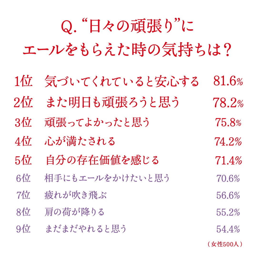 ■自分の“日々の頑張り”に対してエールをもらえると8割以上の女性が「気づいてくれていると安心する」と感じると回答。他にも「また明日も頑張ろうと思う」「頑張ってよかったと思う」などのスコアが高い結果に