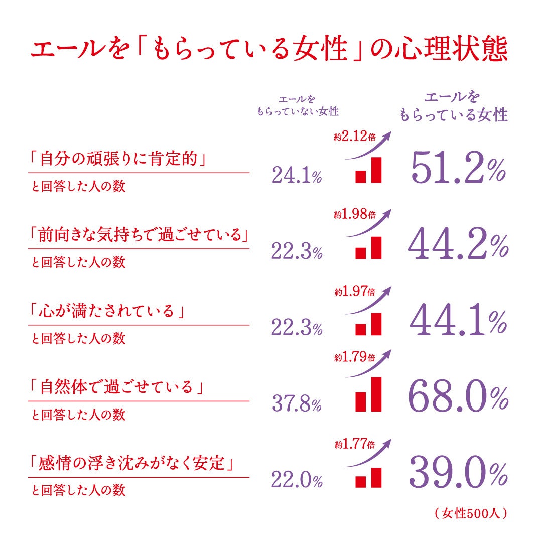 ■身近な人から“日々の頑張り”にエールをもらっている女性の方が「自分の頑張りに肯定的」「前向きな気持ちで過ごせている」「心が満たされている」「ポジティブな心理状態」のスコアが高い結果に