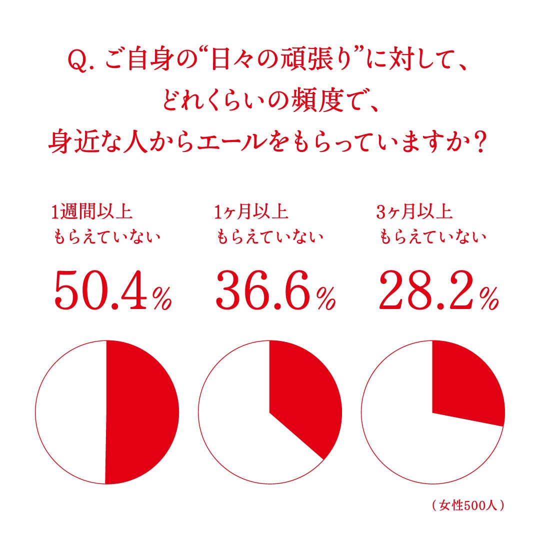 ■自分の“日々の頑張り”に「1週間以上エールをもらえていない」と回答した女性はおよそ2人に1人(50.4%)、「1か月以上エールをもらえていない」と回答した女性はおよそ3人に1人(36.3%)、そして「3か月以上エールをもらえていない」と回答っした女性はおよそ3割(36.3%)いることが判明