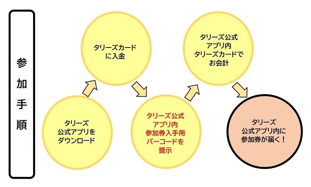 「タリーズ公式アプリ」内の参加券入手用バーコードをお会計前に従業員(フェロー)に提示の上、「タリーズ公式アプリ」登録のタリーズカードで 1 会計 700 円以上(税込)お買い上げいただくと参加券を取得できます。