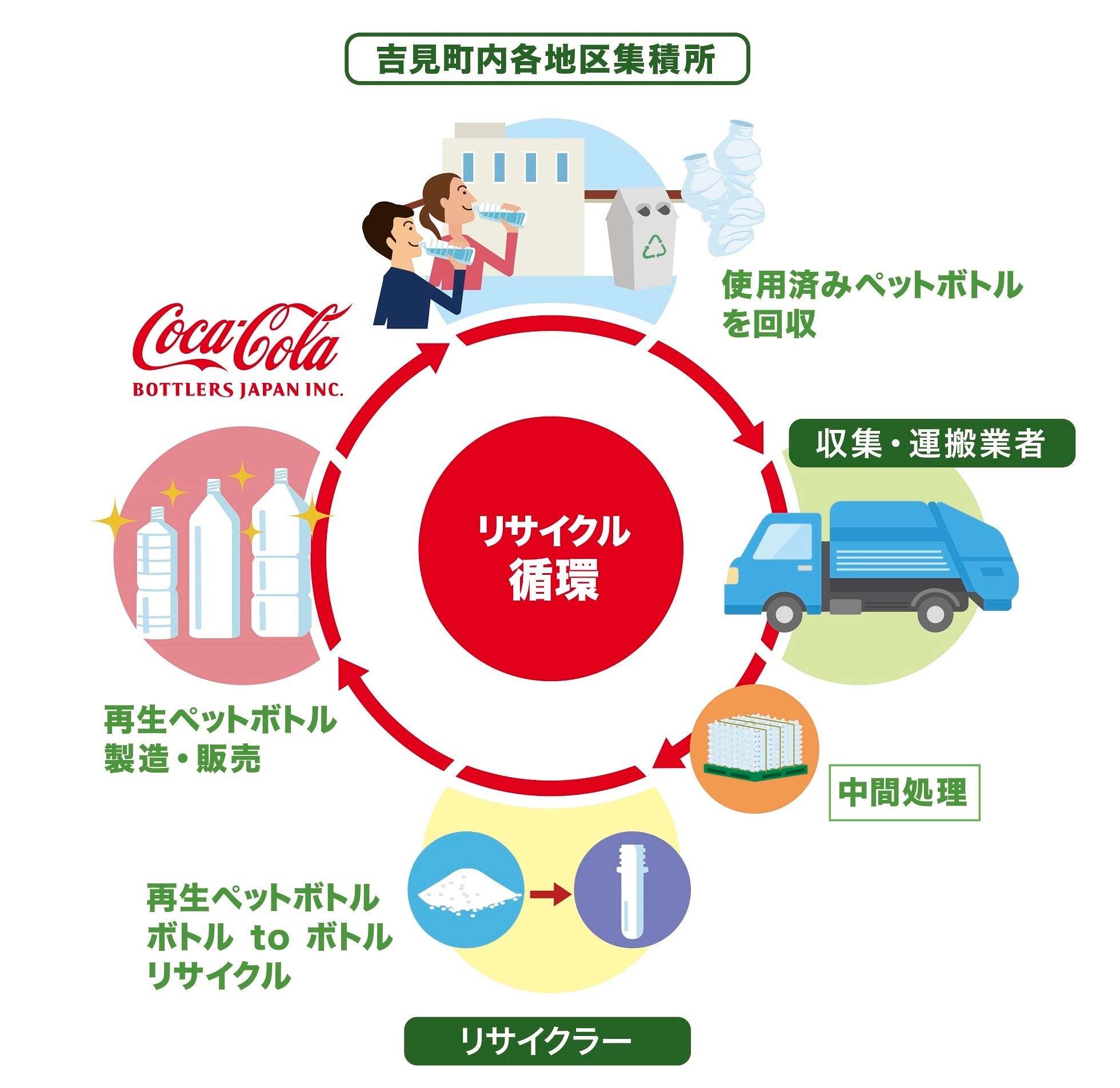 当社はコカ・コーラシステムが目指す「容器の2030年ビジョン」(注1)において、パートナーとの協働による着実な容器回収・リサイクルスキームの構築などに取り組んでいます。このたび本協定に基づき、当社と吉見町は、「ボトルtoボトル」事業を協働することで、町民・事業者・行政の三者が一体となり、日本国内におけるPETボトルの循環利用への貢献を目指します。
