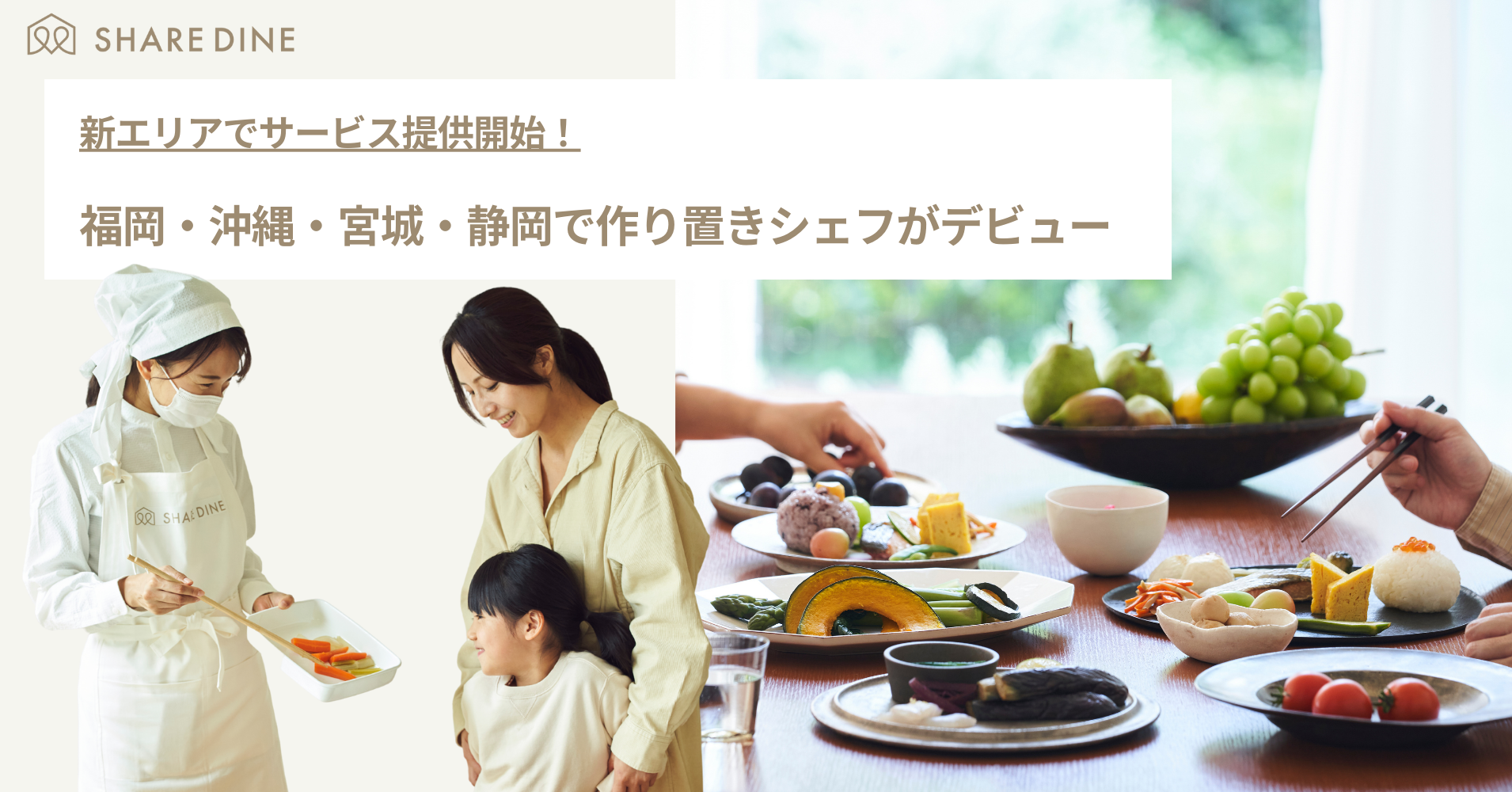 栄養士から一流レストランシェフまで約1,900名のシェフが登録する作り置きシェフサービス「シェアダイン」を運営する株式会社シェアダイン(共同代表:井出有希、本社:東京都港区、以下シェアダイン)は、2022年4月より提供エリアを拡大し、福岡県・沖縄県・宮城県・静岡県エリアでサービスを開始します。これまで関東・関西・東海エリアを主とし、北海道、青森、新潟の一部地域にてサービスを提供する中、エリア拡大へのご要望の声をいただいていました。新しくサービスを開始するエリアにおいて、シェフの様々なスキルと家庭を繋ぐことで、より一層多様なニーズに応え、パーソナライズなサービスを提供してまいります。