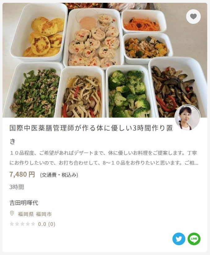 栄養士・調理師などの資格を持った食の専門家が、作り置きシェフとして約1,900名登録する日本最大級の作り置きシェフサービス。産前産後のお食事、離乳食から筋トレ・ボディメイク、生活習慣病対策のお食事までライフステージに合わせて、家庭における料理をパーソナライズ。行事食やパーティコース料理など特別な日のお料理にも対応しています。 1回3時間〜献立の提案、食材の買い出しから、12品前後のお料理をお作りします。