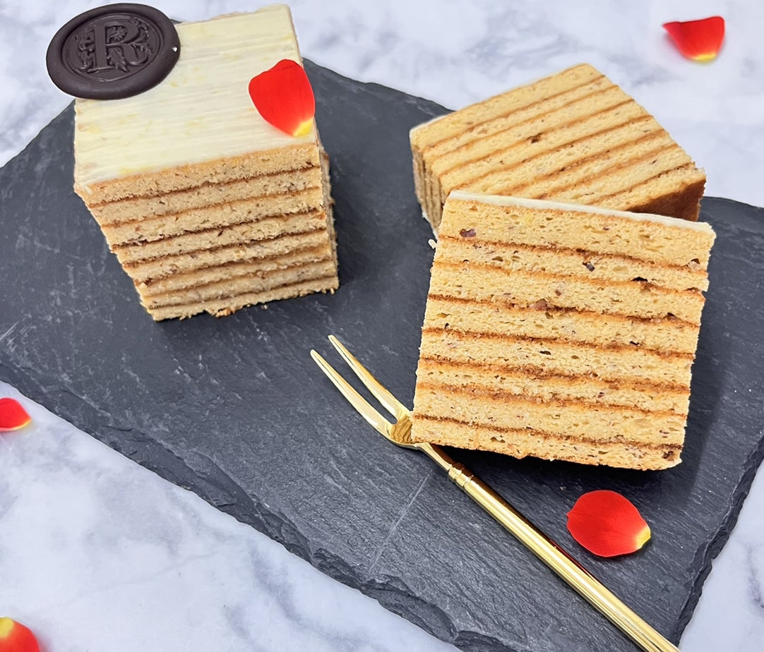 ・8層に重ねた生地を1層ずつ焼く温度を変え、水分を飛ばさないように丁寧に焼き上げることで、通常のバームクーヘンとは少し違った食感を楽しめるように。