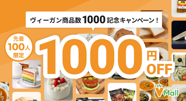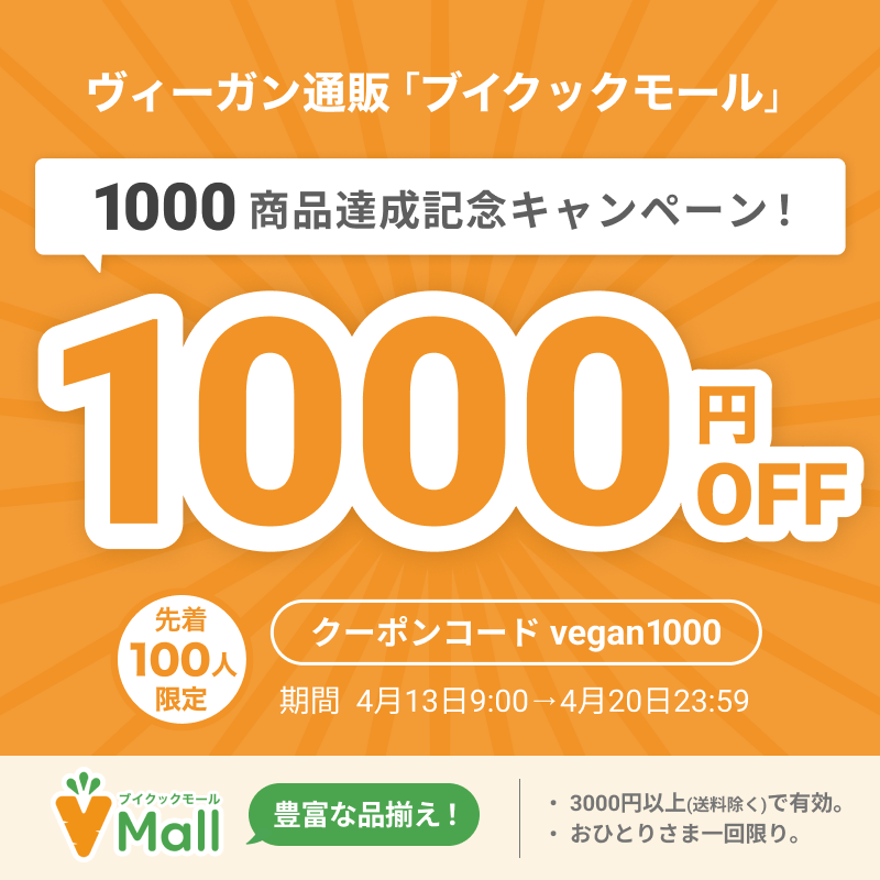 ヴィーガン商品数1,000を達成したことを記念し、本日4月13日9:00〜4月20日23:59の期間で、100名限定1,000円OFFキャンペーンを実施いたします。