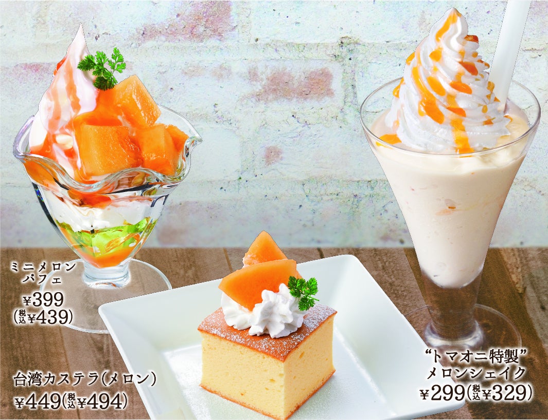 その他、トマオニの定番メニューとなった”トマオニ特製”メロンシェイクや、食後のデザートにぴったりなミニメロンパフェ、台湾カステラ(メロン)をご用意しております。メロンを心ゆくまでご堪能ください。