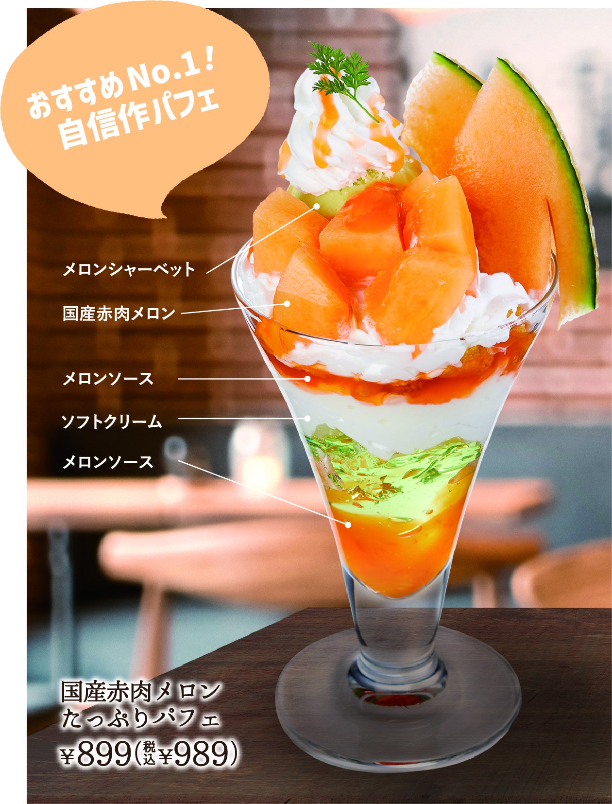 まさにメロン好きのためのメロン尽くしのパフェ。大きくカットされた赤肉メロンがトッピングされ見た目も華やか。