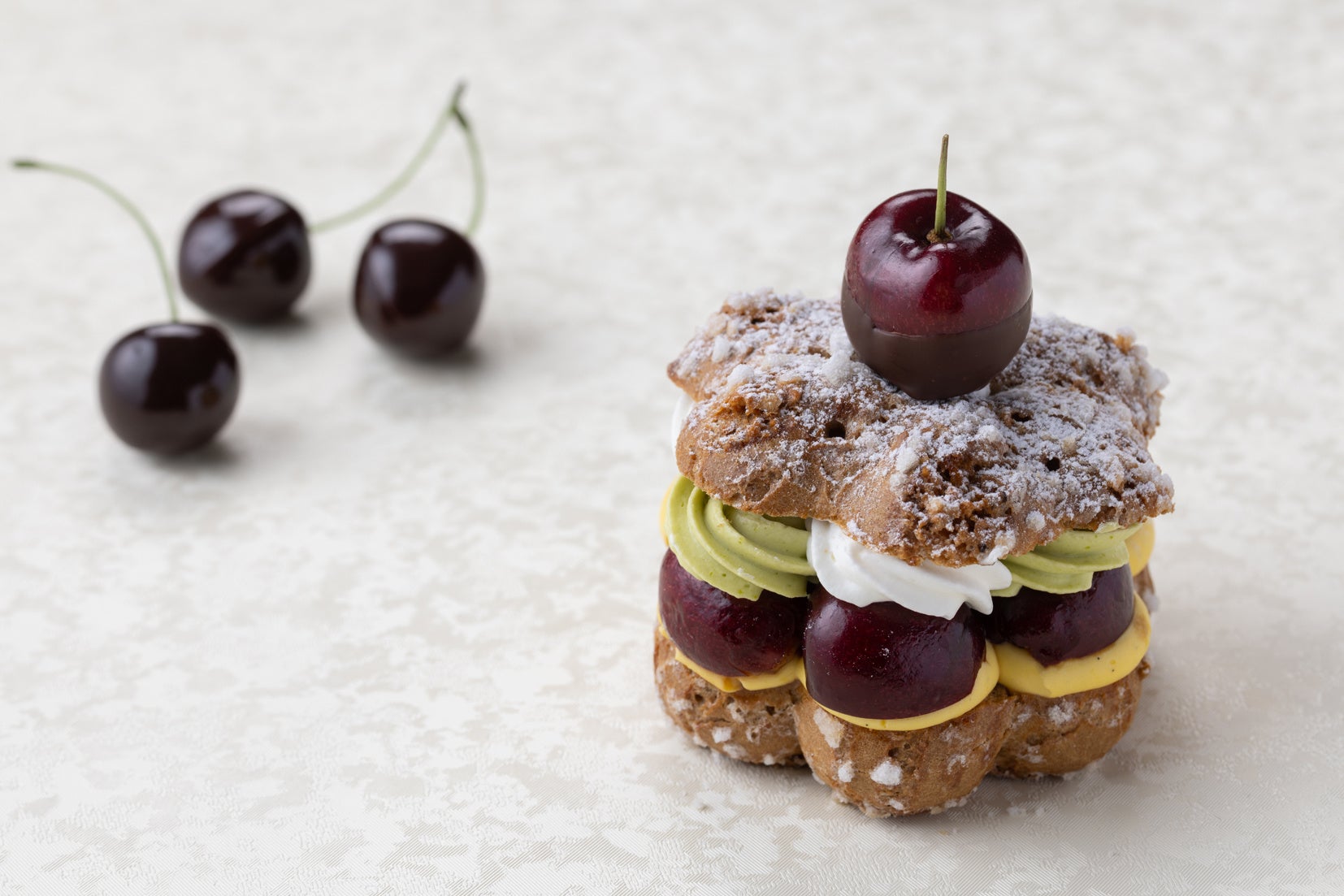花のような見た目も可愛らしい、人気のパリブレストのチェリーバージョンです。チョコレートのシュー生地にジューシーなチェリージャムを敷き込み、その上からカスタードクリーム、フレッシュチェリーを乗せ、ピスタチオクリームと生クリームを交互にしぼり、シューで挟んだ一品です。シュー生地の軽い食感とジューシーなチェリー、濃厚なクリームのハーモニーが絶妙です。交互に違うクリームのブロックを食べて味の違いを楽しめる一品です。