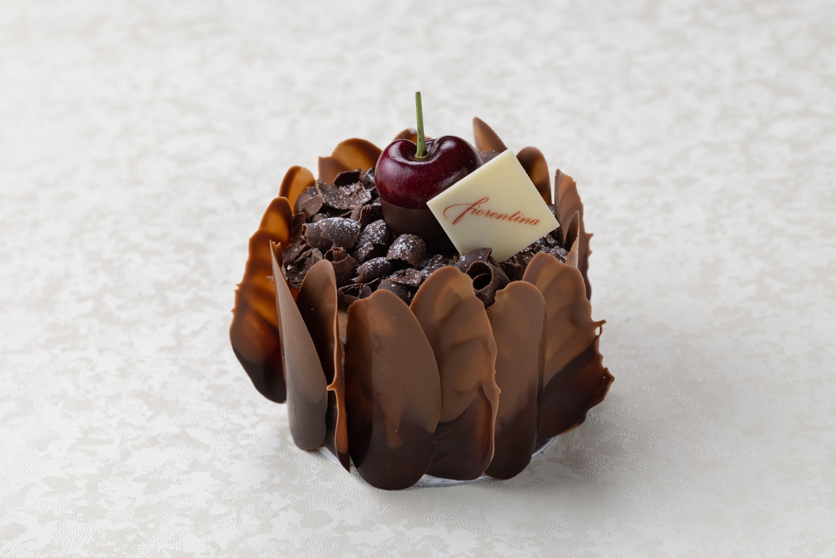 赤ワインでコンポートしたチェリー、濃厚なジャージー牛の生クリームと最高級タヒチ産のバニラをつかったクレームブリュレを、キルシュ(発酵させたさくらんぼの果汁から造られるブランデー)のシロップをしみこませたチョコレート味のスポンジでサンドし、ジャージー牛の生クリームでコーティングしました。ケーキの周りには、ホテルオリジナルチョコレート「Grande H」を使用した羽根チョコレートをデコレーションしています。