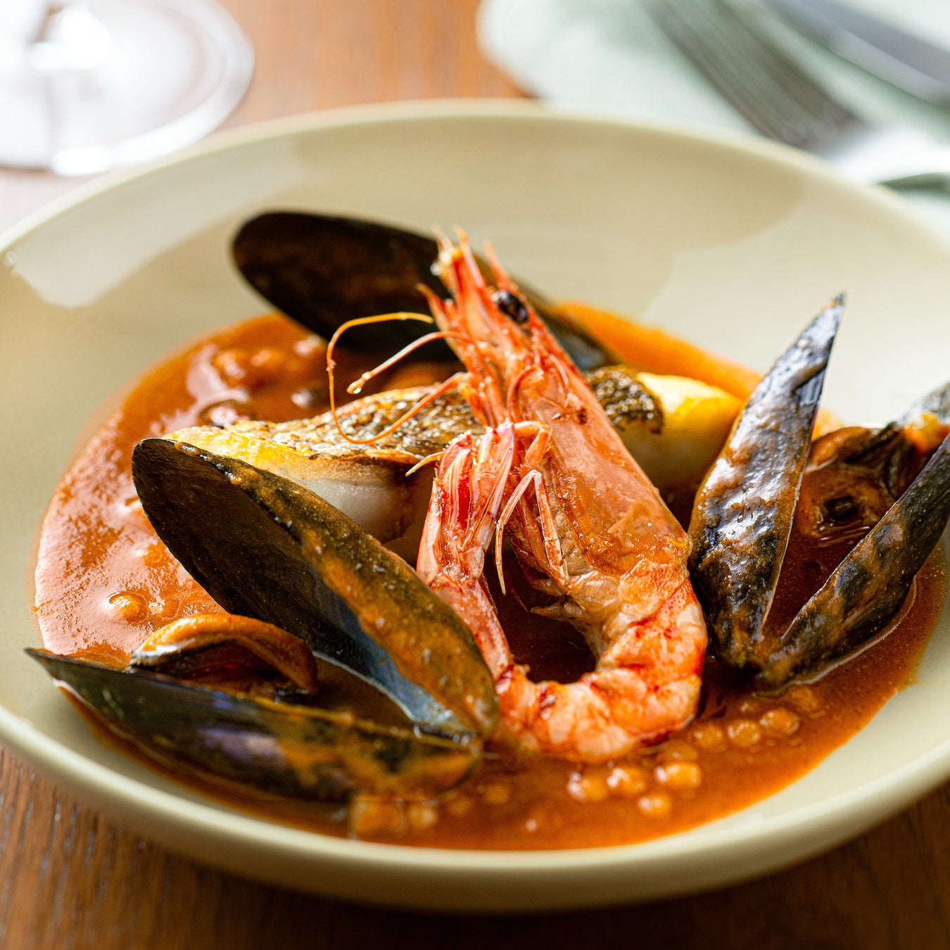 魚のアラやエビの殻、貝の出汁、トマトなど煮込んだ裏ごしスープ。サルデーニャ島伝統のつぶつぶパスタ「フレーグラ」を加え、車海老や鯛、ムール貝を添えました。