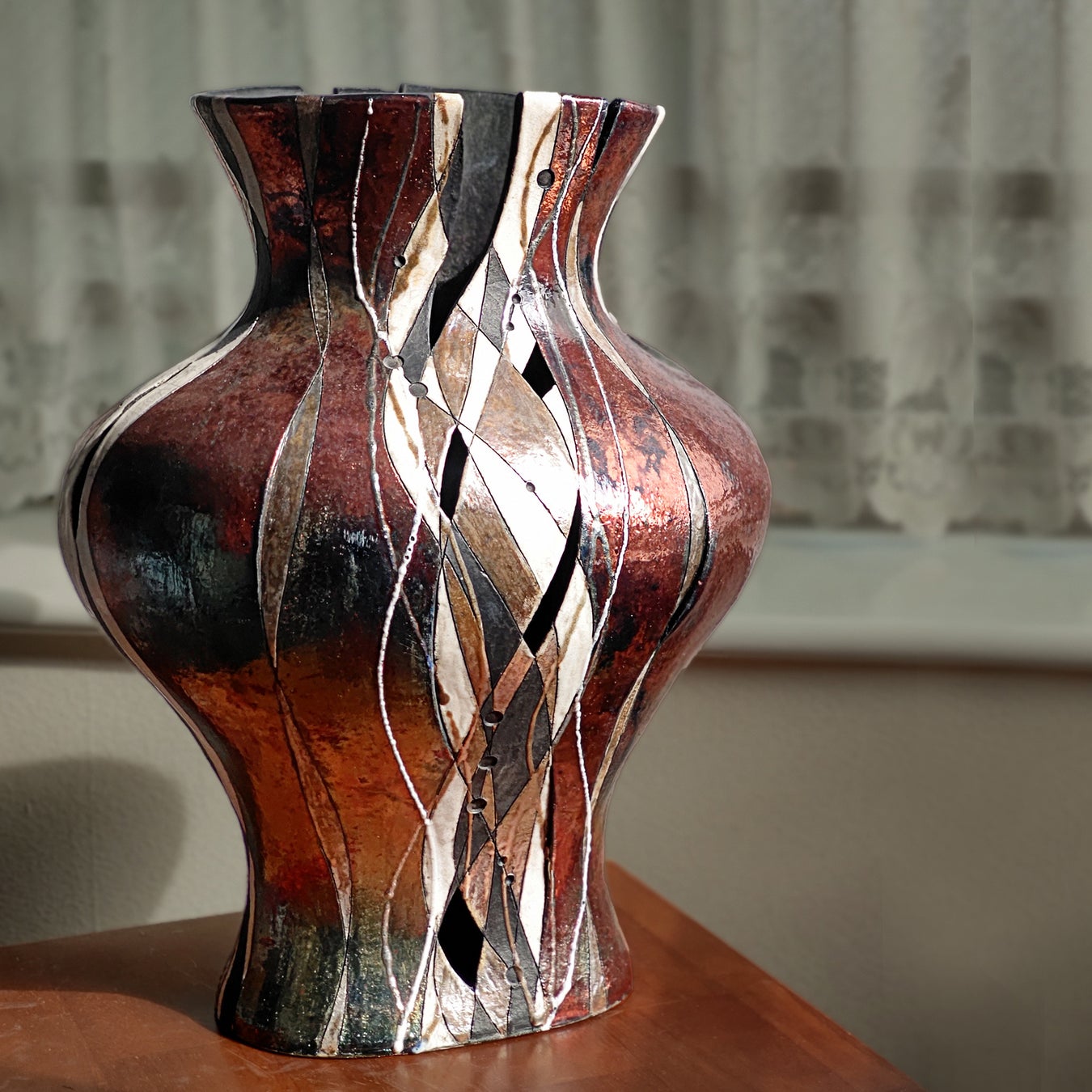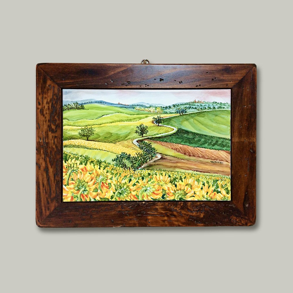 陶器をキャンバスに見立て、ウンブリア州の風景に溶け込んだひまわりと鮮やかな樹々が、繊細な筆遣いで描かれています。