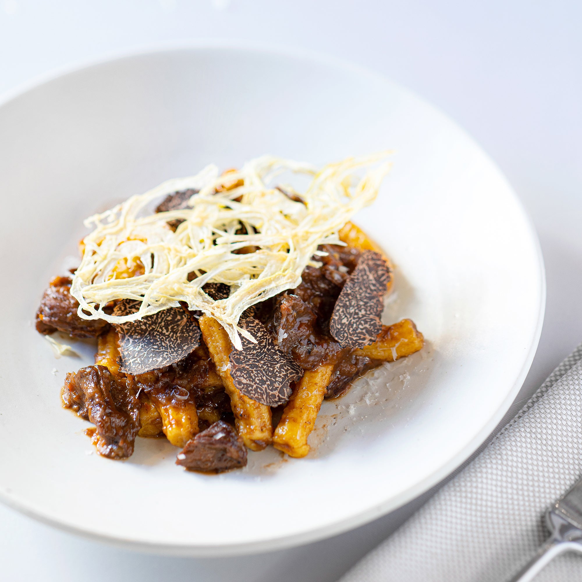 ヴェネト地方で親しまれるパスタに、濃厚な鹿肉のラグーソースを合わせ仕上げにトリュフをたっぷりとトッピング。