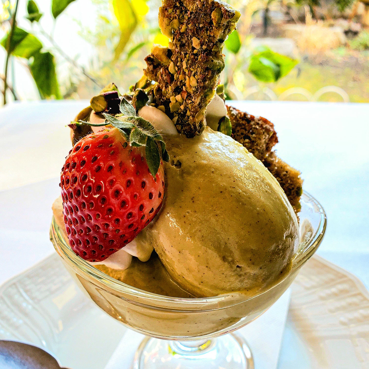 生ピスタチオを使ったジェラートとプリン、ピスタチオケーキやクロッカンテに、イチゴのグラッパマリネがアクセント。ピスタチオの香り高さ、甘味を存分に味わえます。