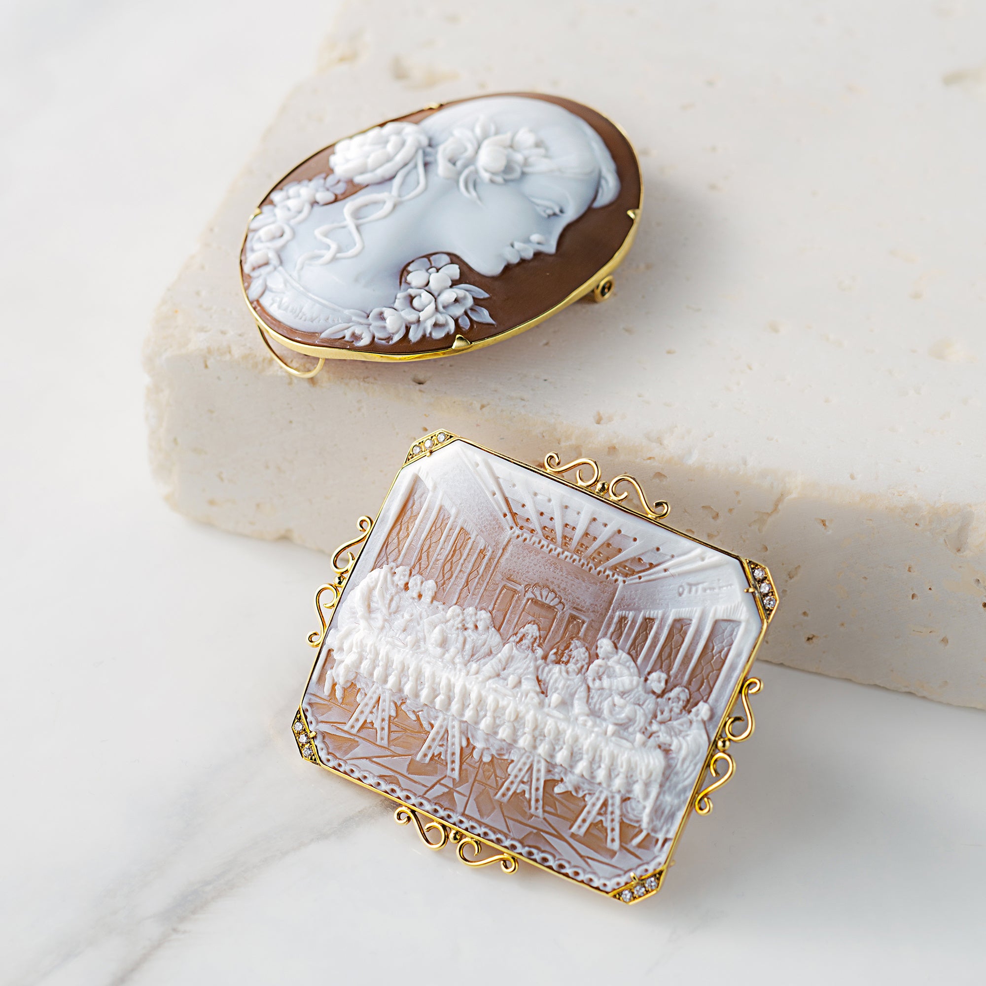 カメオ界の巨匠、パスクアーレ オッターヴィアーノ氏などカメオアーティストの作品が一堂に展開。巨匠が手がける「最後の晩餐」をモチーフにした繊細なひと品から、個性光る若手作家の作品までデザイン多彩なカメオをご紹介。