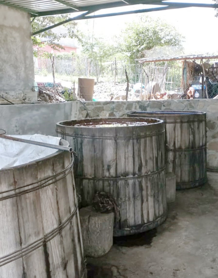 管理しやすいステンレス樽ではなく、伝統的なオーク樽で天然酵母により自然発酵させる。その後2回蒸留を行い製品としてボトリングされる。