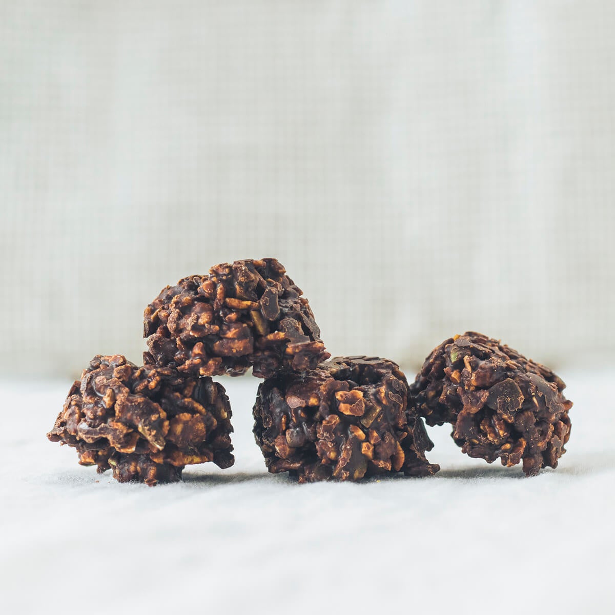 有機アガベシュガーを使用した少しダークなチョコレートを使用。コーンフレークに砕いたアーモンドとかぼちゃの種を混ぜ合わせ、ザックリとした歯ざわりを楽しんでいただけます。
