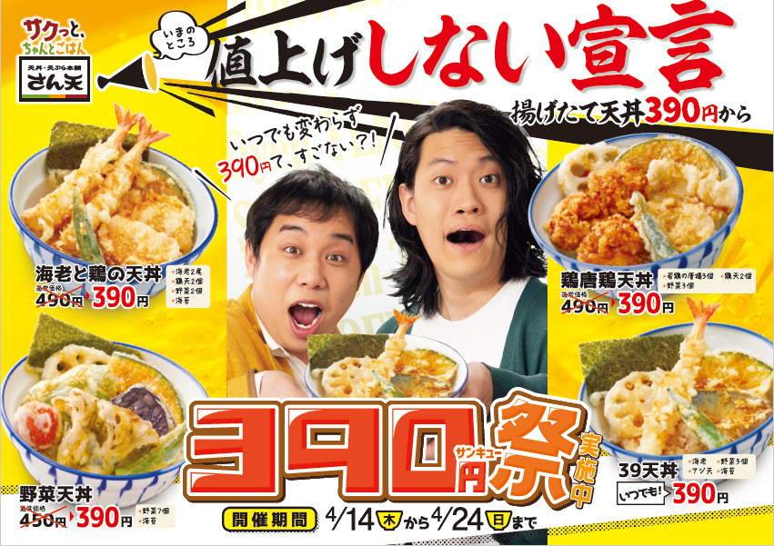 【天丼・天ぷら本舗 さん天】が4月14日(木)から11日間限定で≪天丼390円祭≫を開催!