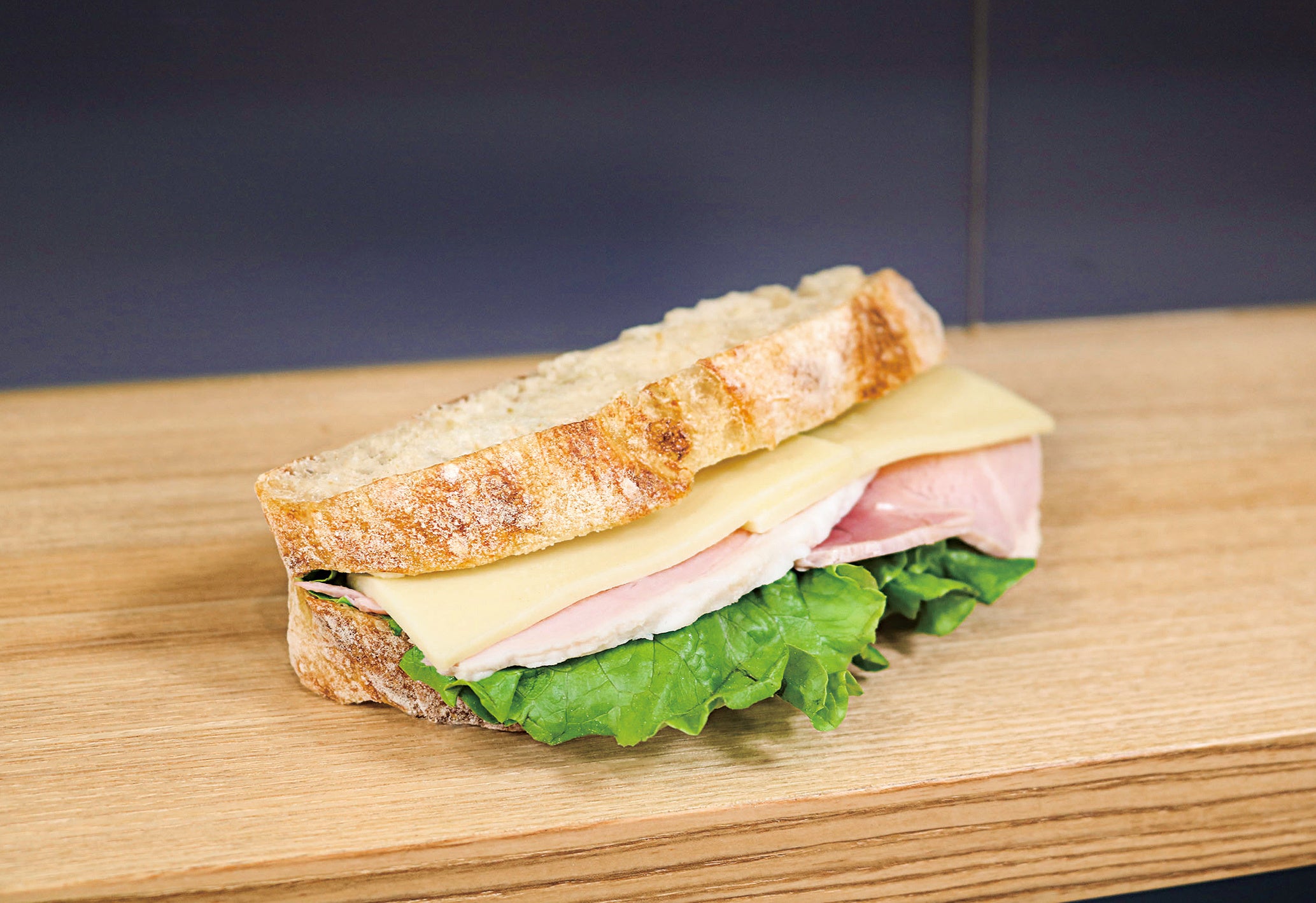 ローストした胚芽を混ぜ込んだ、プチっとした食感と香ばしさが特徴のペイザンサンドの生地は、高加水製法により、みずみずしくモチモチとした食感が自慢の一品。塩気のあるハム、マイルドでコクのあるチーズとバターの ミルキーさが口の中で優しく広がる、マスタードの酸味がアクセントのサンドイッチです。