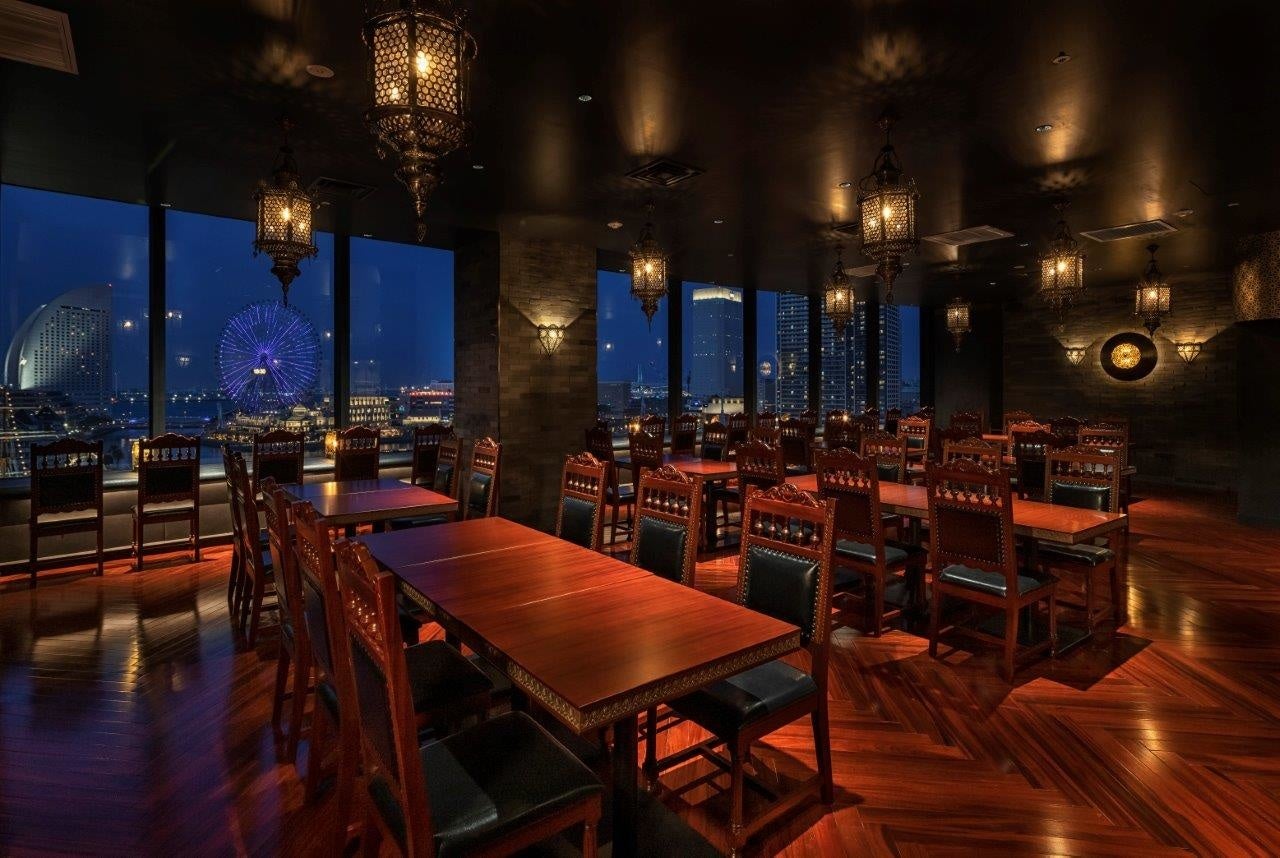 アラビア装飾と明治の文明開化期の洋館を折衷した世界のどこにもない空間と、眼前に広がる圧倒的な港の夜景はまさに非日常の世界。