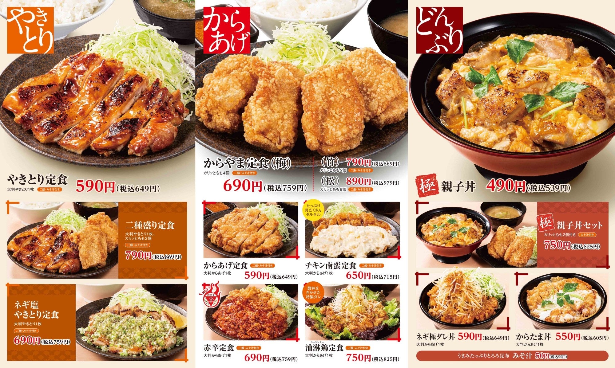 2022年3月、からあげ以外の鶏料理をもっと身近に手軽に楽しんでいただきたいと考え、⽇本⼈に愛されている「からあげ」だけでなく「親子丼」や大判の「やきとり」メニューなどが仲間入りした、新グランドメニューを販売開始いたしました。