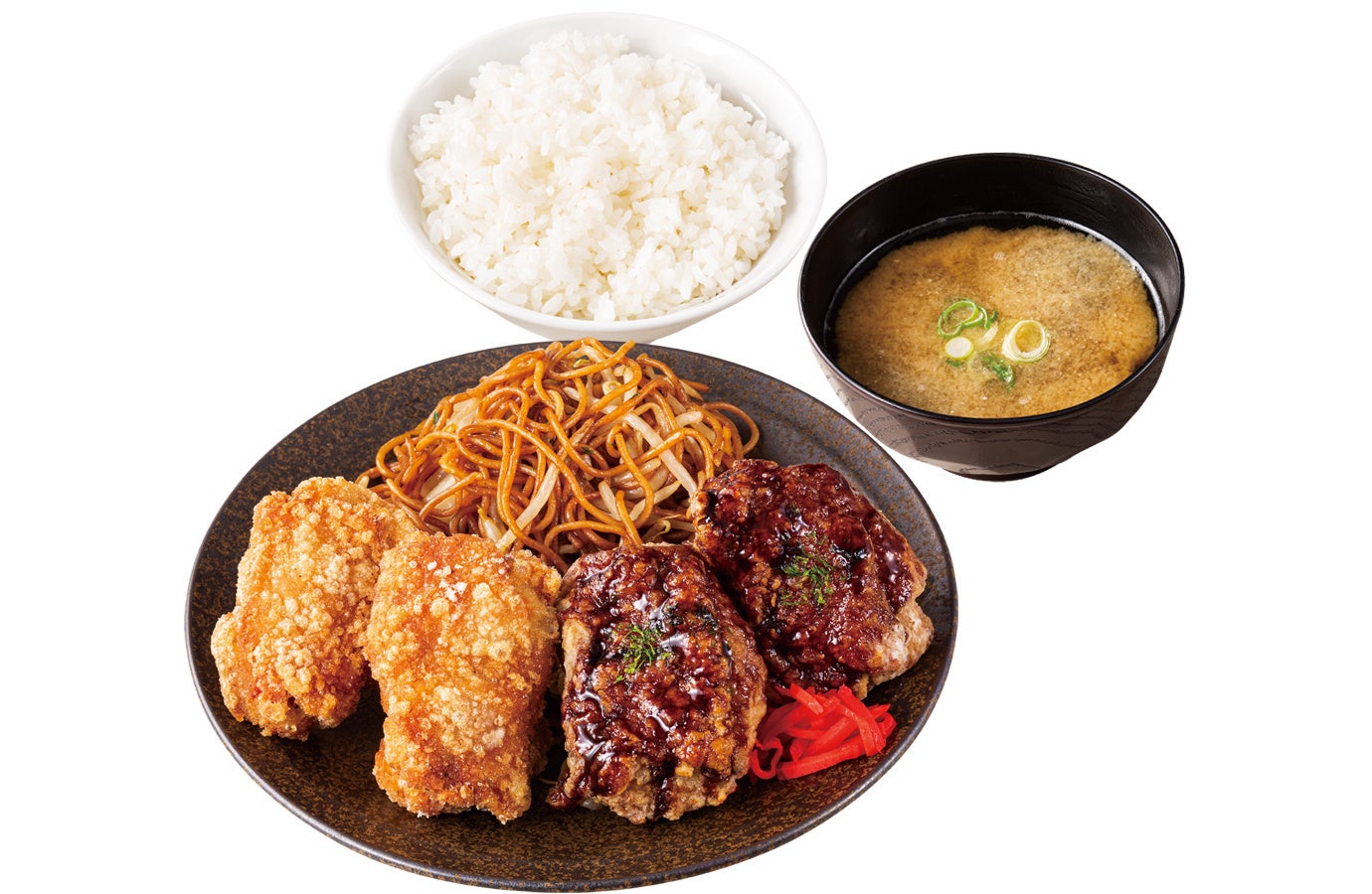 ソースからあげ2個、カリッともも2個、千切りキャベツまたは焼きそば、ご飯、みそ汁