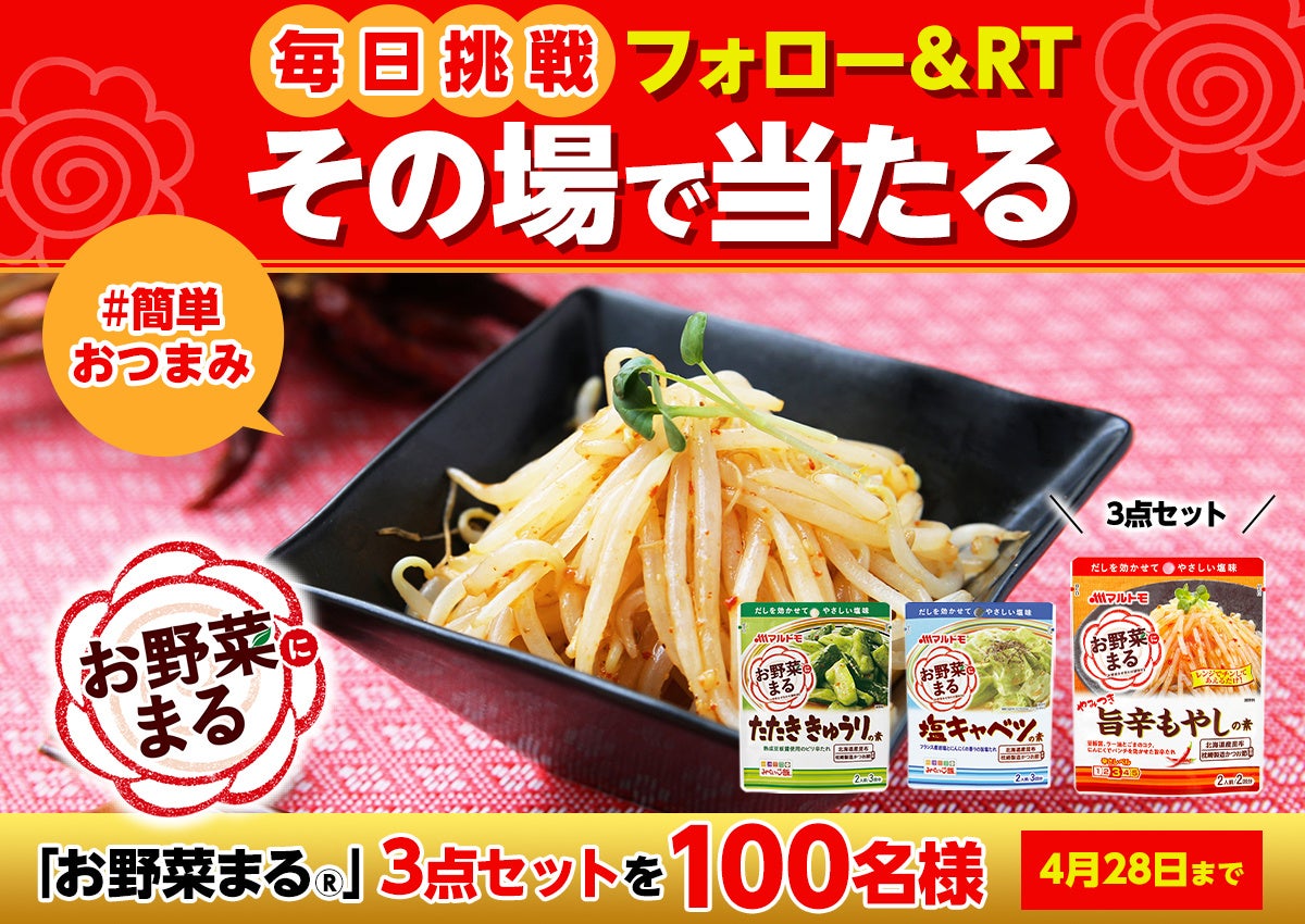 マルトモ株式会社(社長:今井均 本社:愛媛県伊予市)は、2022年春夏の新商品発売を記念して、もやしを使った、だしのうま味とピリ辛味でやみつきになるメニューが作れる「お野菜まるⓇ旨辛もやしの素40g×2」と「お野菜まるⓇ」シリーズとしてご好評をいただいている「たたききゅうりの素40g×3」「塩キャベツの素40g×3」をセットにして抽選で100名様にその場で当たるフォロー&リツイートキャンペーンを実施いたします。