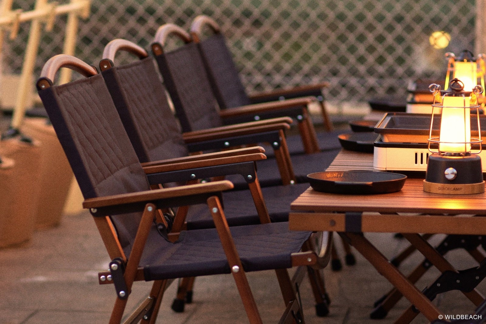 ローテーブル、ファブリックチェアー、トランクカーゴなどアーバンキャンプをテーマにした「グランピング」テイスト空間。都心で気軽で優雅なアウトドア気分を。