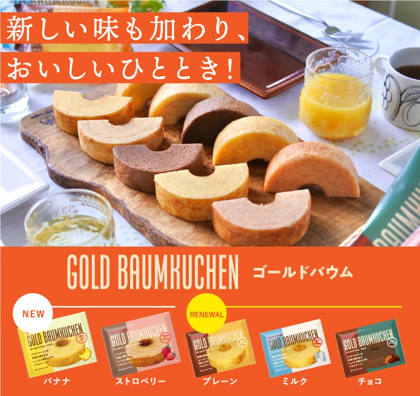 ヤマトフーズ株式会社(本社:広島県広島市、代表取締役:串山 敬太)は、ゴールドバウムのデザインを一新し、2022年4月より現行品3品をリニューアル、新たに2品を新発売いたします。