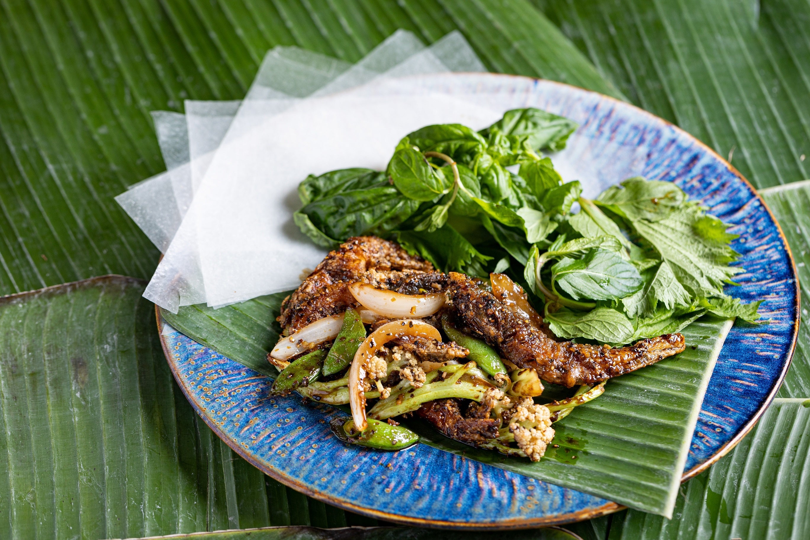 運ばれてきた瞬間、ついついごはんを注文したくなるような食欲をそそるニンニクの香り。そして、レモングラスの爽やかな香りが押し寄せてきます。香り高い油を纏ったソフトシェルシュリンプは、海老の旨味を頭から尻尾まで丸ごと味わえます。パリッと音がするぐらい新鮮なマーメラスを使うことで食感が豊かに、そして、混ぜるごとにしんなりと甘みを増していくフライドオニオンが味に広がりを持たせてくれます。これからの季節にぴったりのエスニック料理です。